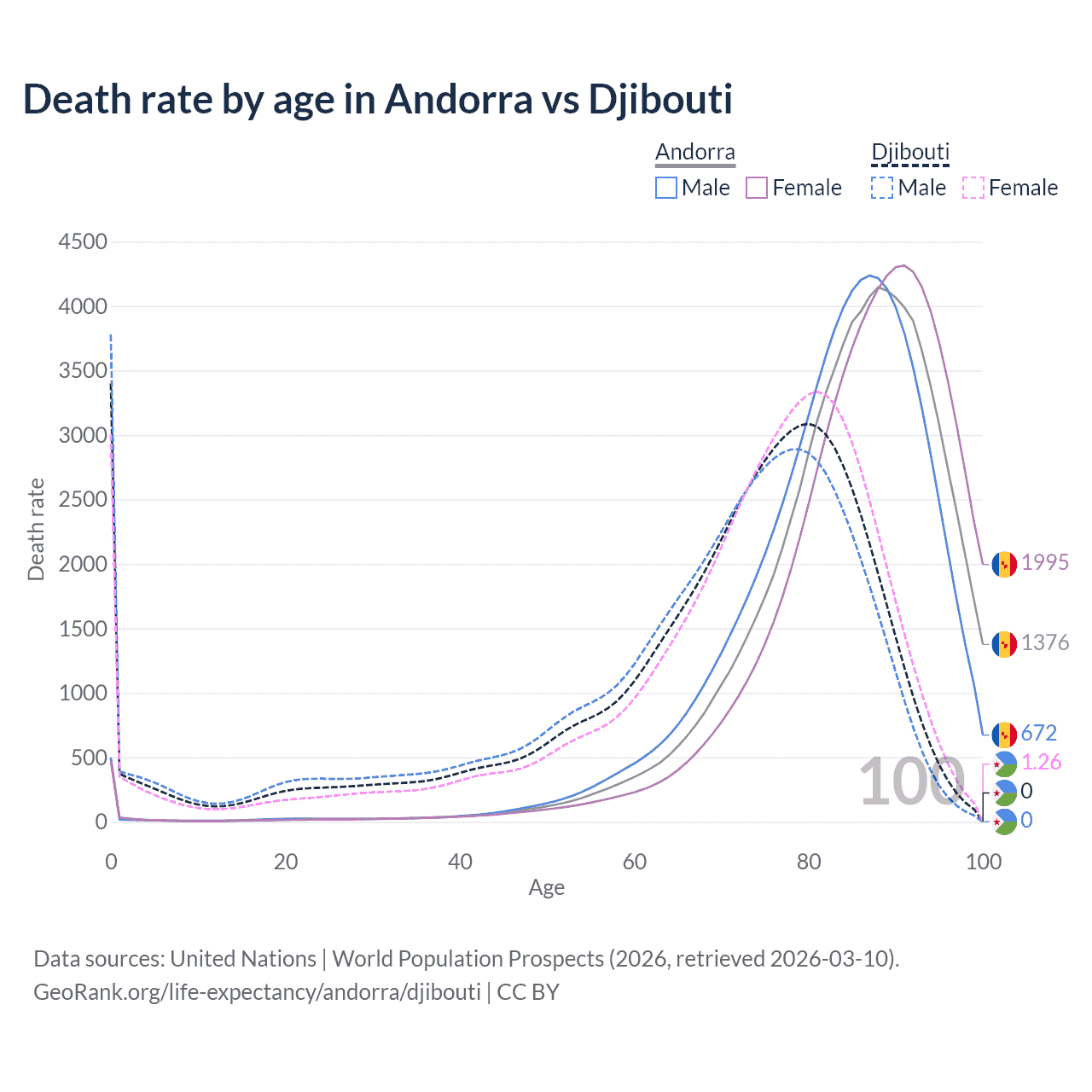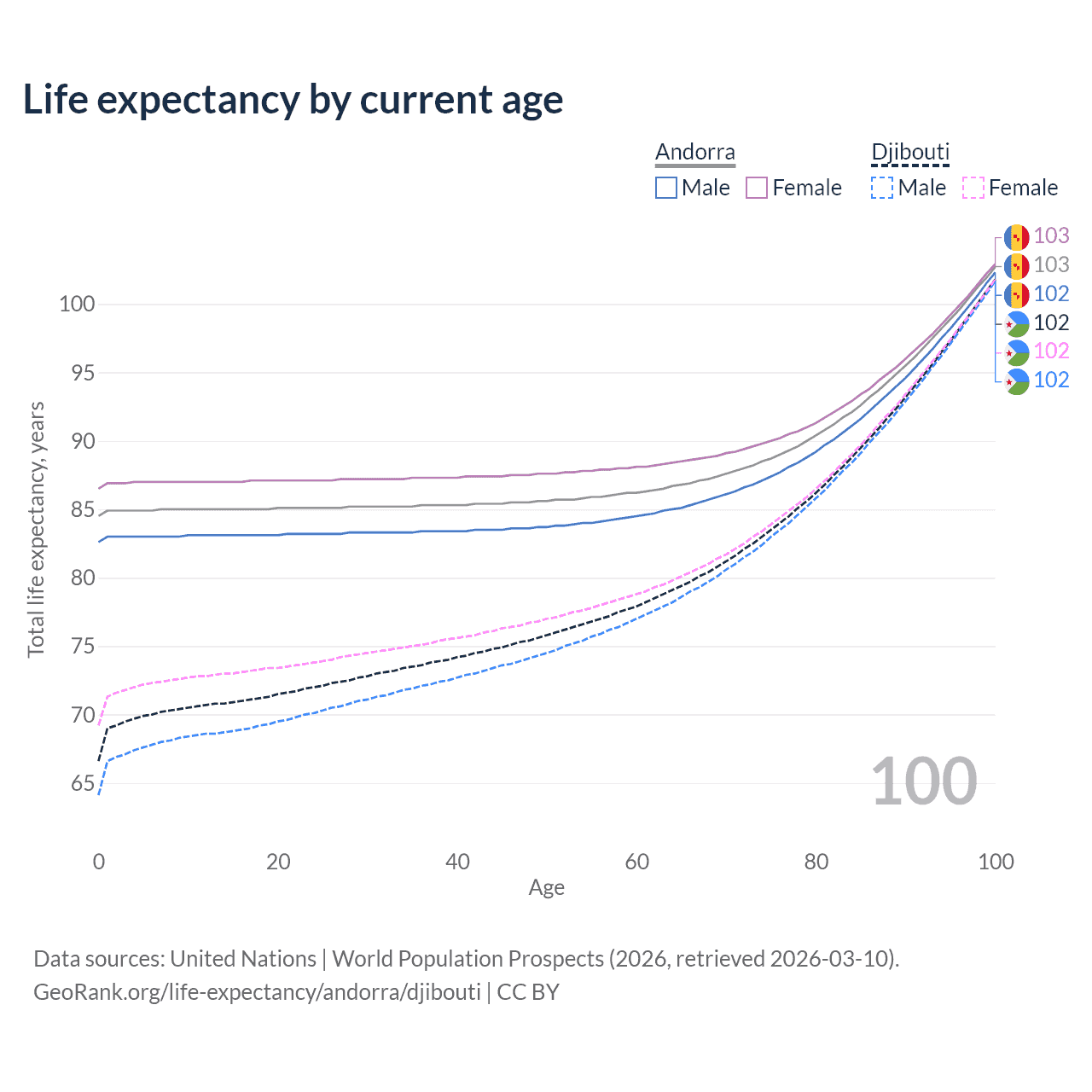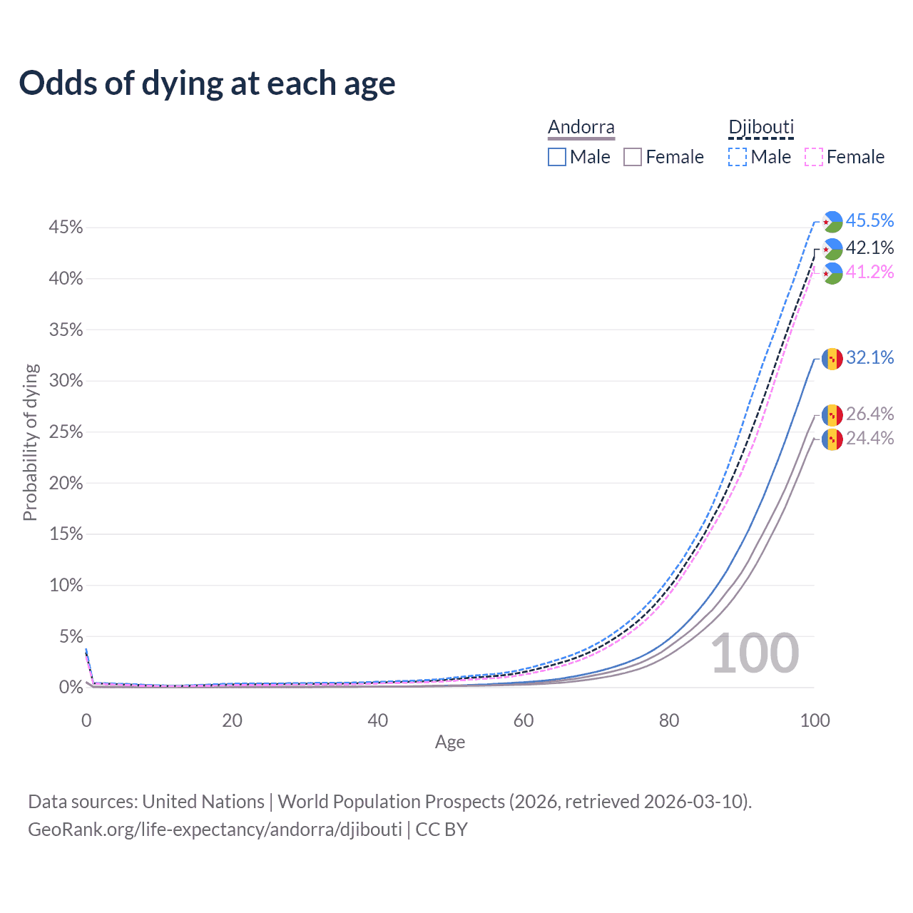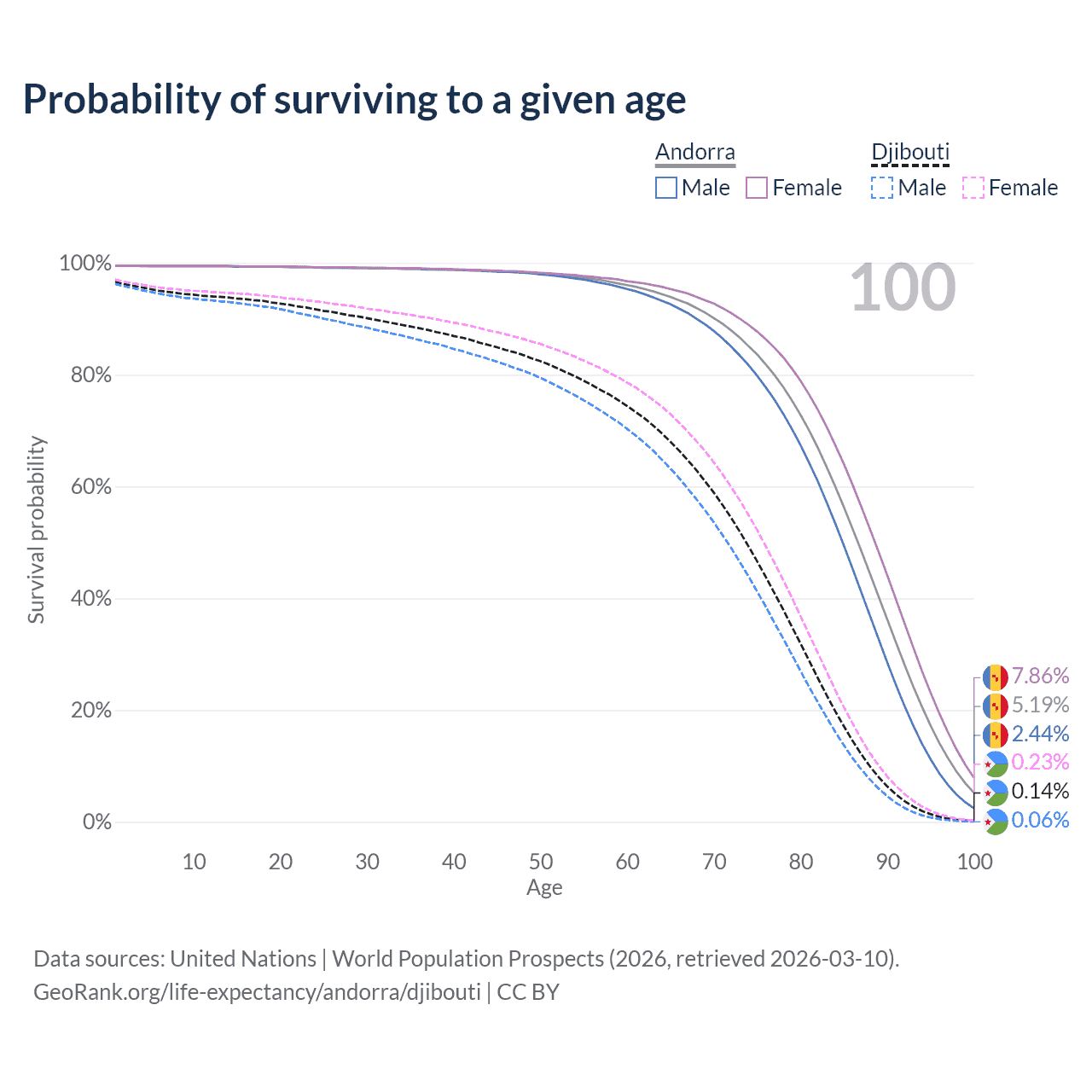 This life expectancy calculator shows the odds of living to 100, 95, 90, and below based on current age for both males and females in Andorra and Djibouti, along with mean and median age of death. The calculations are based on the 2026 life tables (actuarial tables) from the UN World Population Prospects.