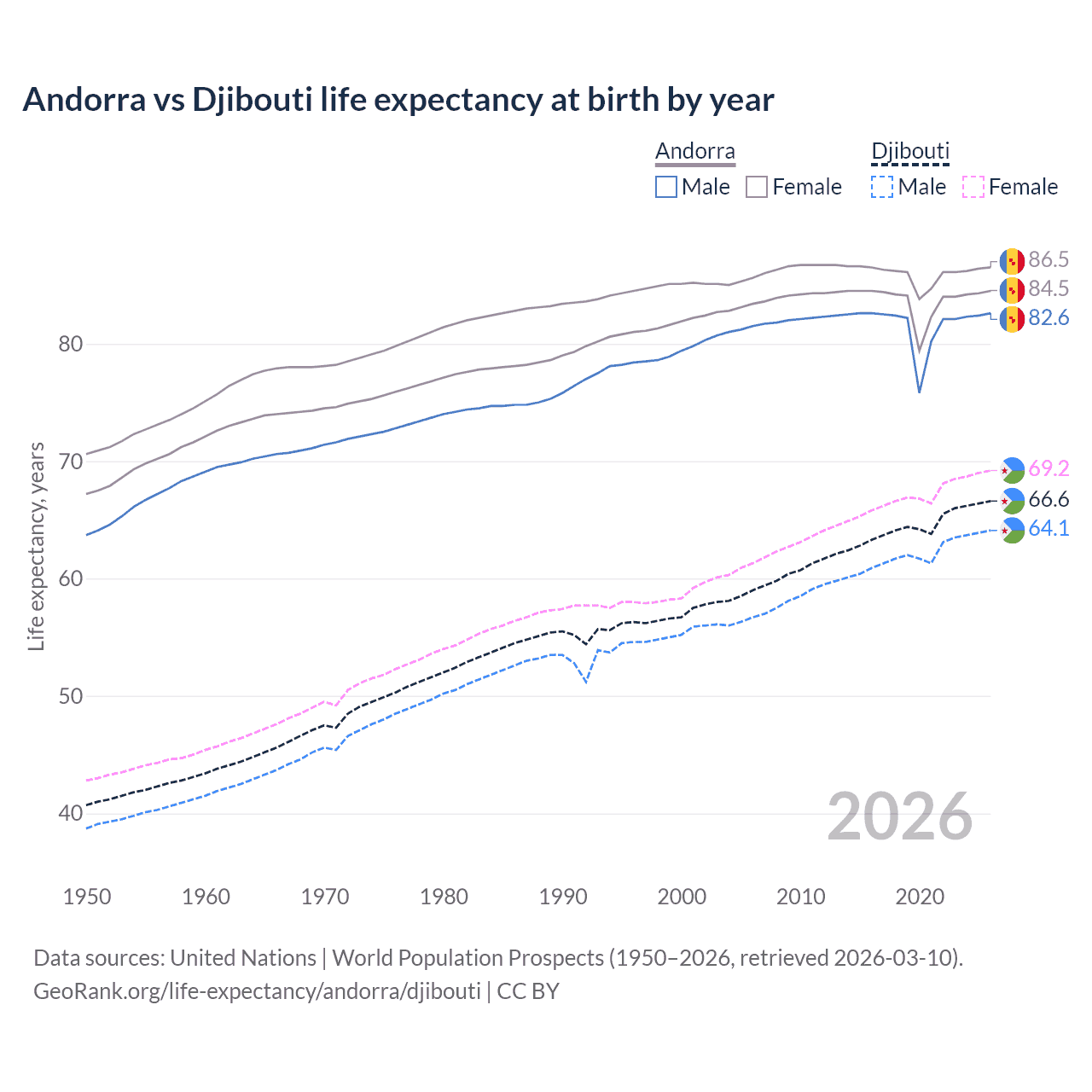 The average life expectancy at birth is 84.5 years in Andorra vs 66.6 in Djibouti. Andorra is ranked 5/197 by life expectancy, and Djibouti is 165/197. In Andorra, the life expectancy is 82.6 years for males and 86.5 years for females. In Djibouti, it's 64.1 years for males and 69.2 years for females.