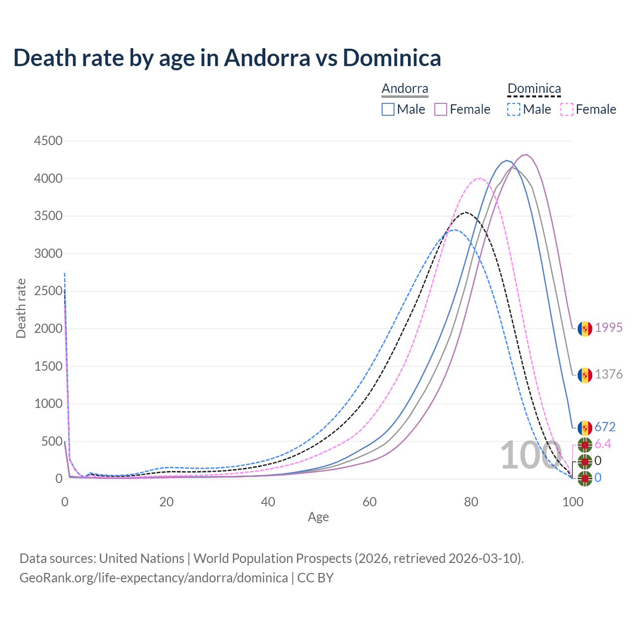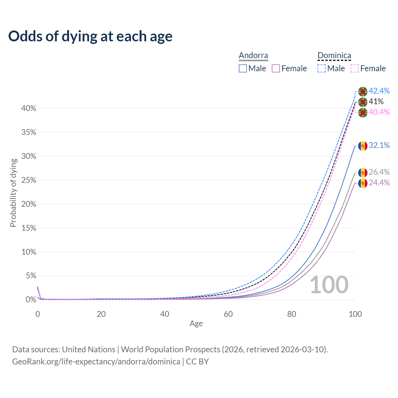 This life expectancy calculator shows the odds of living to 100, 95, 90, and below based on current age for both males and females in Andorra and Dominica, along with mean and median age of death. The calculations are based on the 2026 life tables (actuarial tables) from the UN World Population Prospects.