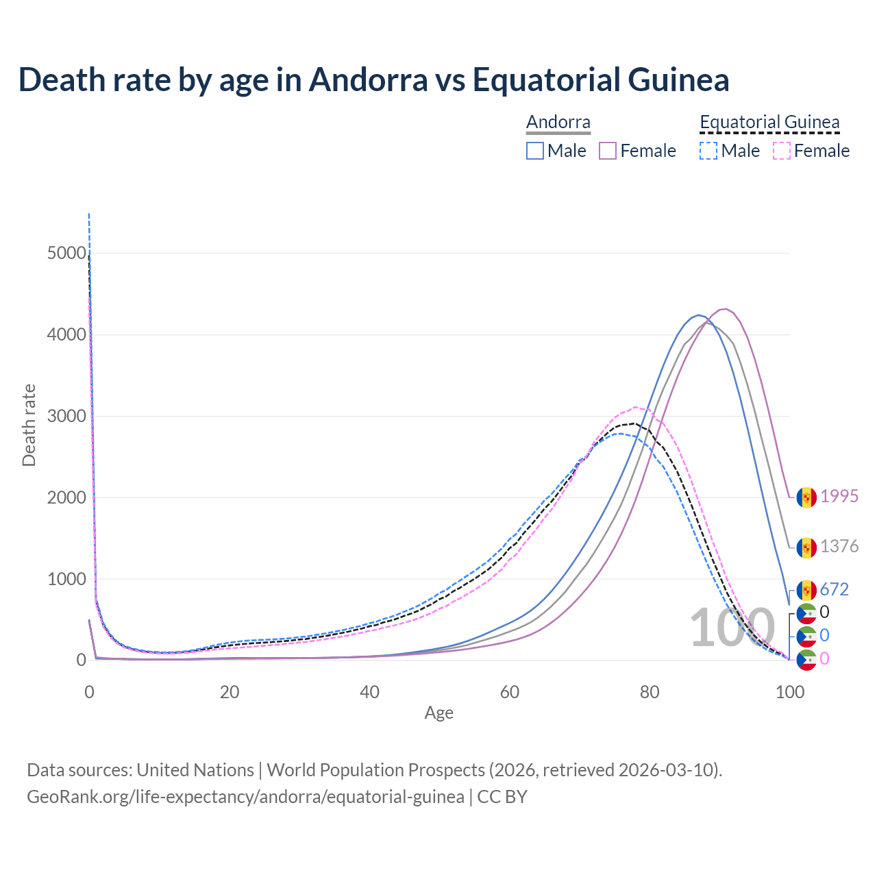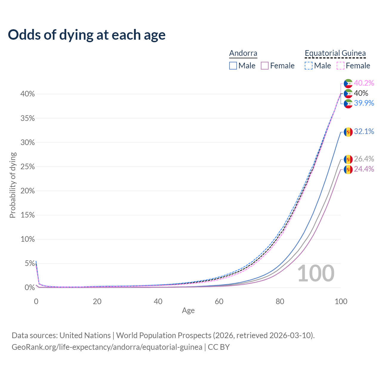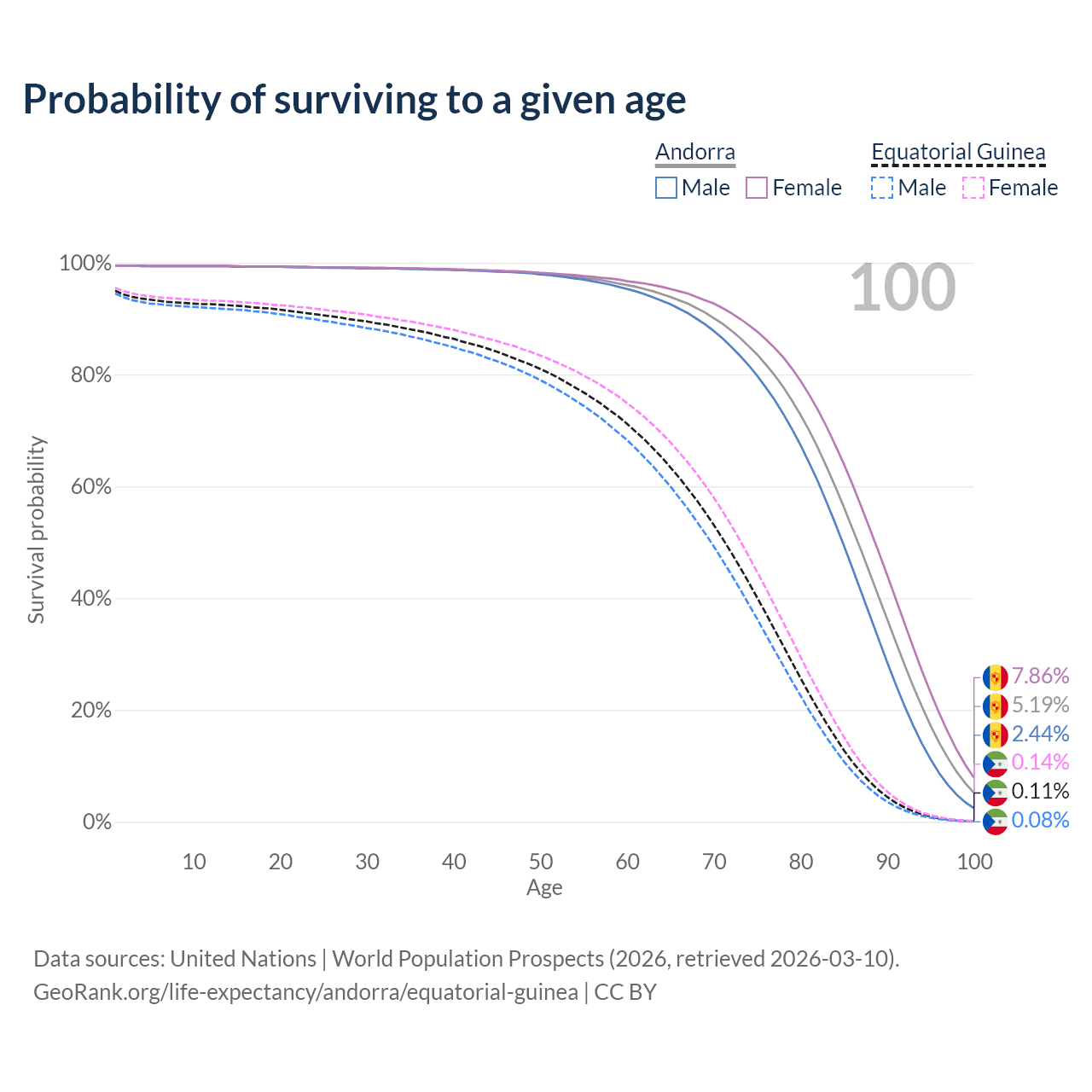 This life expectancy calculator shows the odds of living to 100, 95, 90, and below based on current age for both males and females in Andorra and Equatorial Guinea, along with mean and median age of death. The calculations are based on the 2026 life tables (actuarial tables) from the UN World Population Prospects.