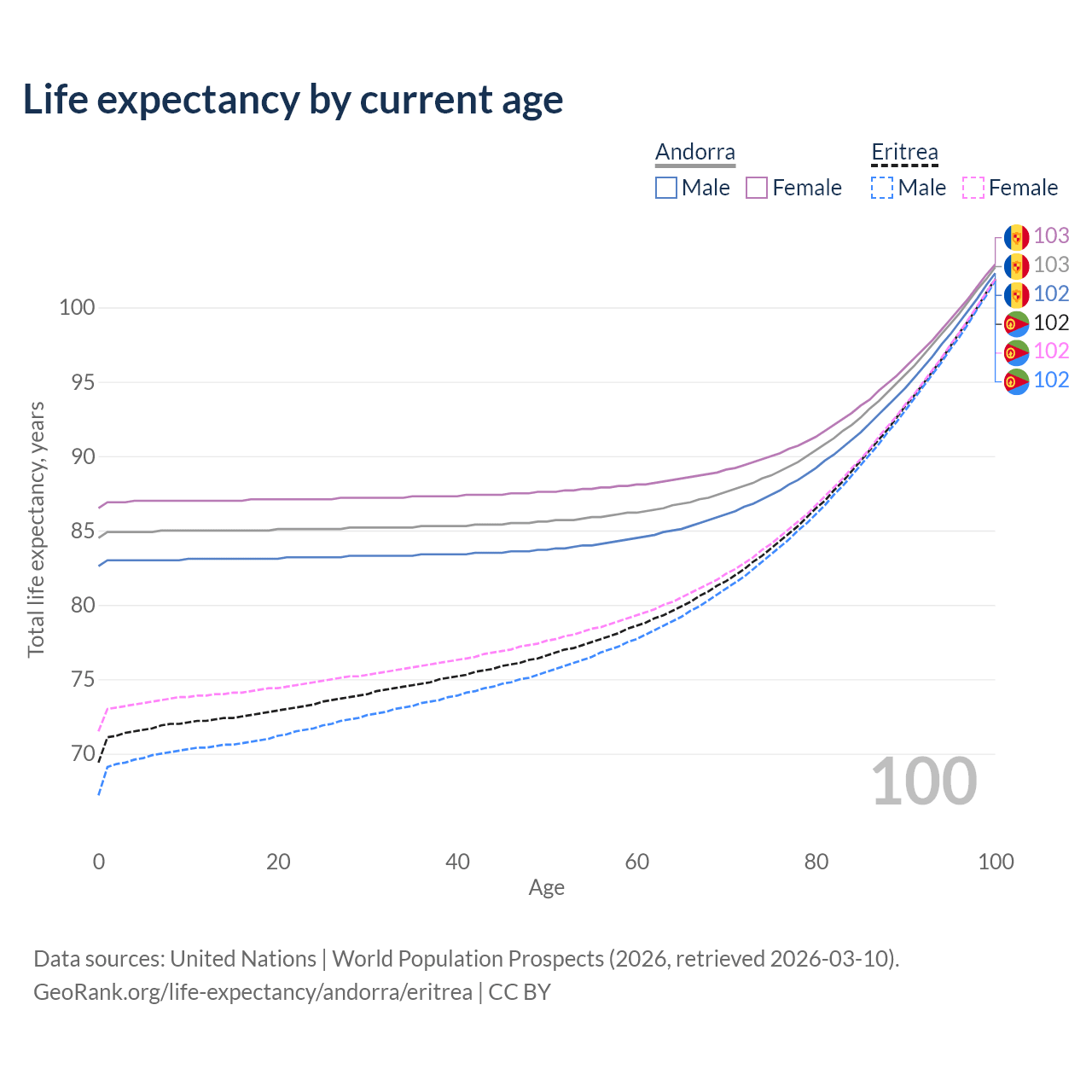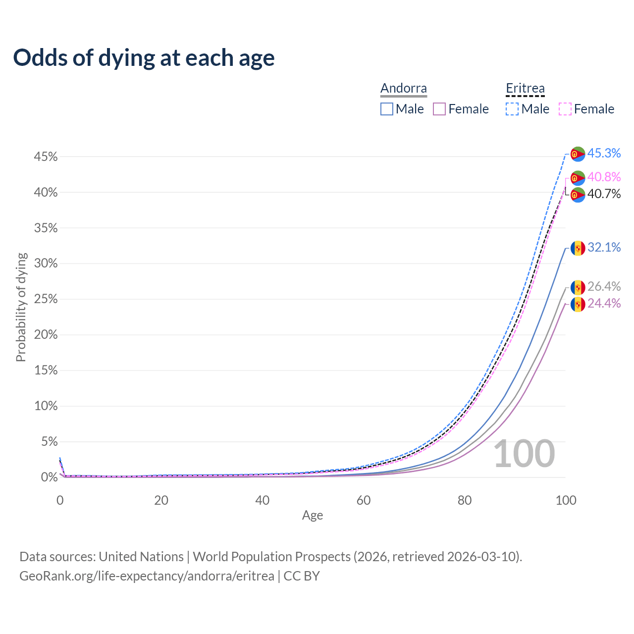 This life expectancy calculator shows the odds of living to 100, 95, 90, and below based on current age for both males and females in Andorra and Eritrea, along with mean and median age of death. The calculations are based on the 2026 life tables (actuarial tables) from the UN World Population Prospects.