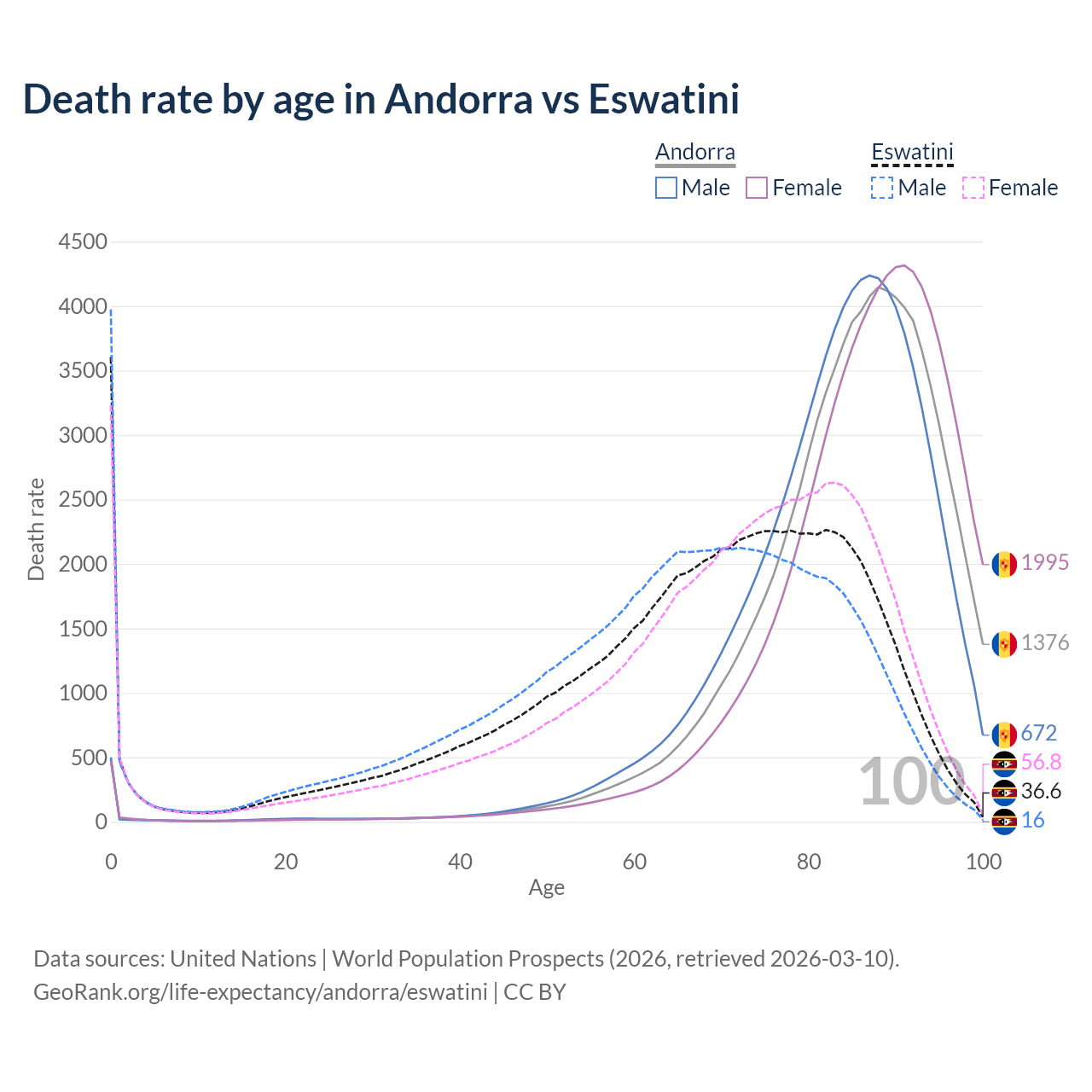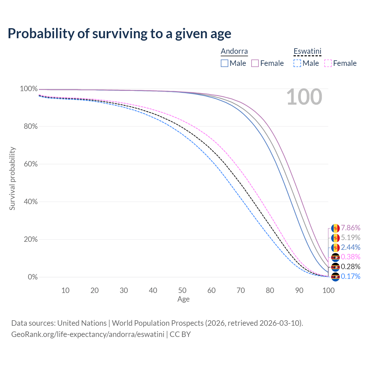 This life expectancy calculator shows the odds of living to 100, 95, 90, and below based on current age for both males and females in Andorra and Eswatini, along with mean and median age of death. The calculations are based on the 2026 life tables (actuarial tables) from the UN World Population Prospects.