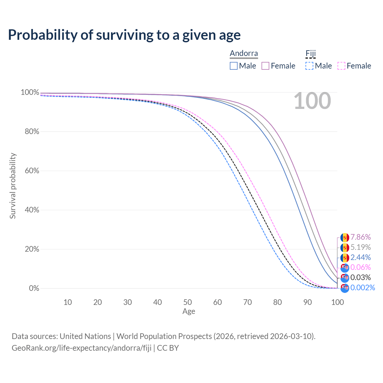 This life expectancy calculator shows the odds of living to 100, 95, 90, and below based on current age for both males and females in Andorra and Fiji, along with mean and median age of death. The calculations are based on the 2026 life tables (actuarial tables) from the UN World Population Prospects.