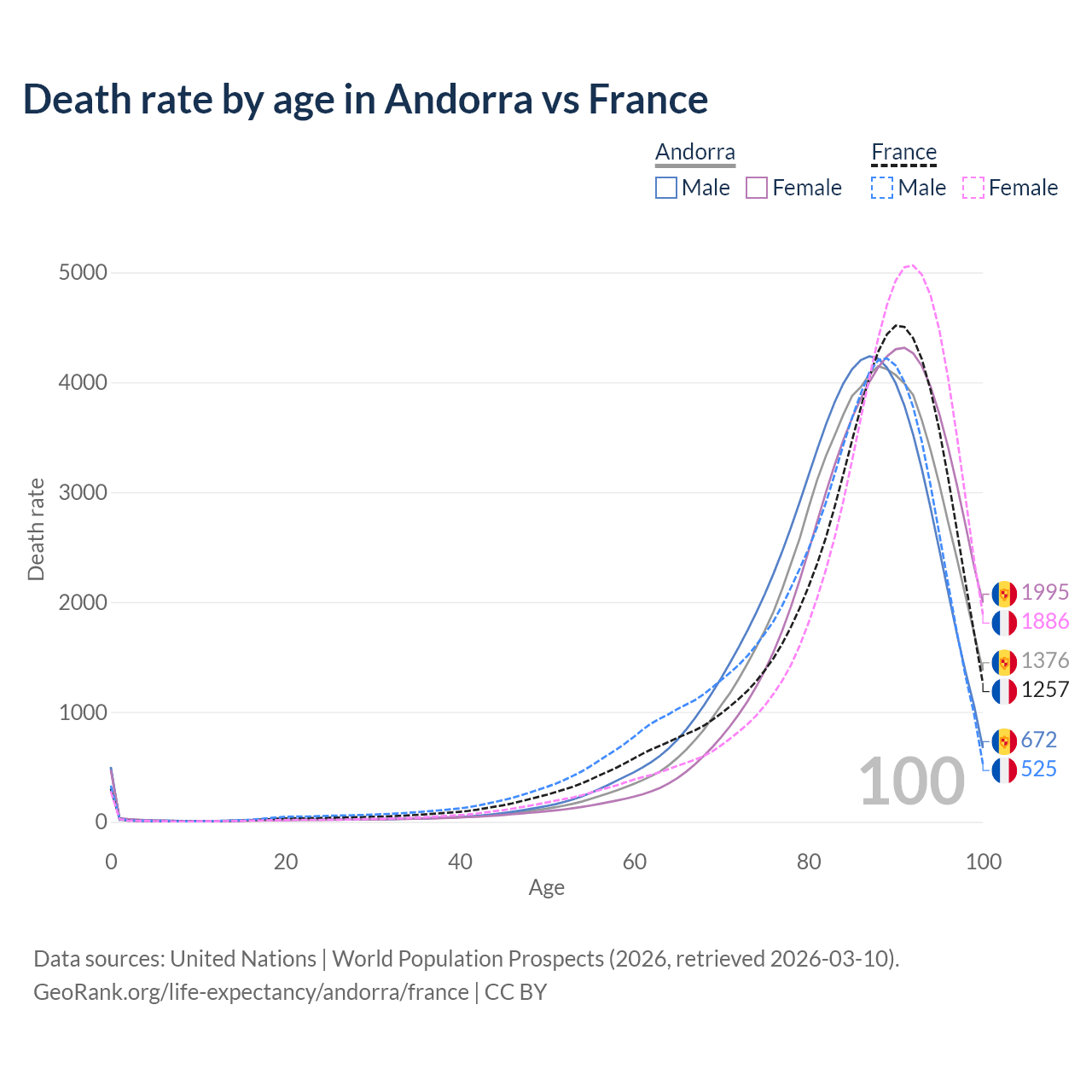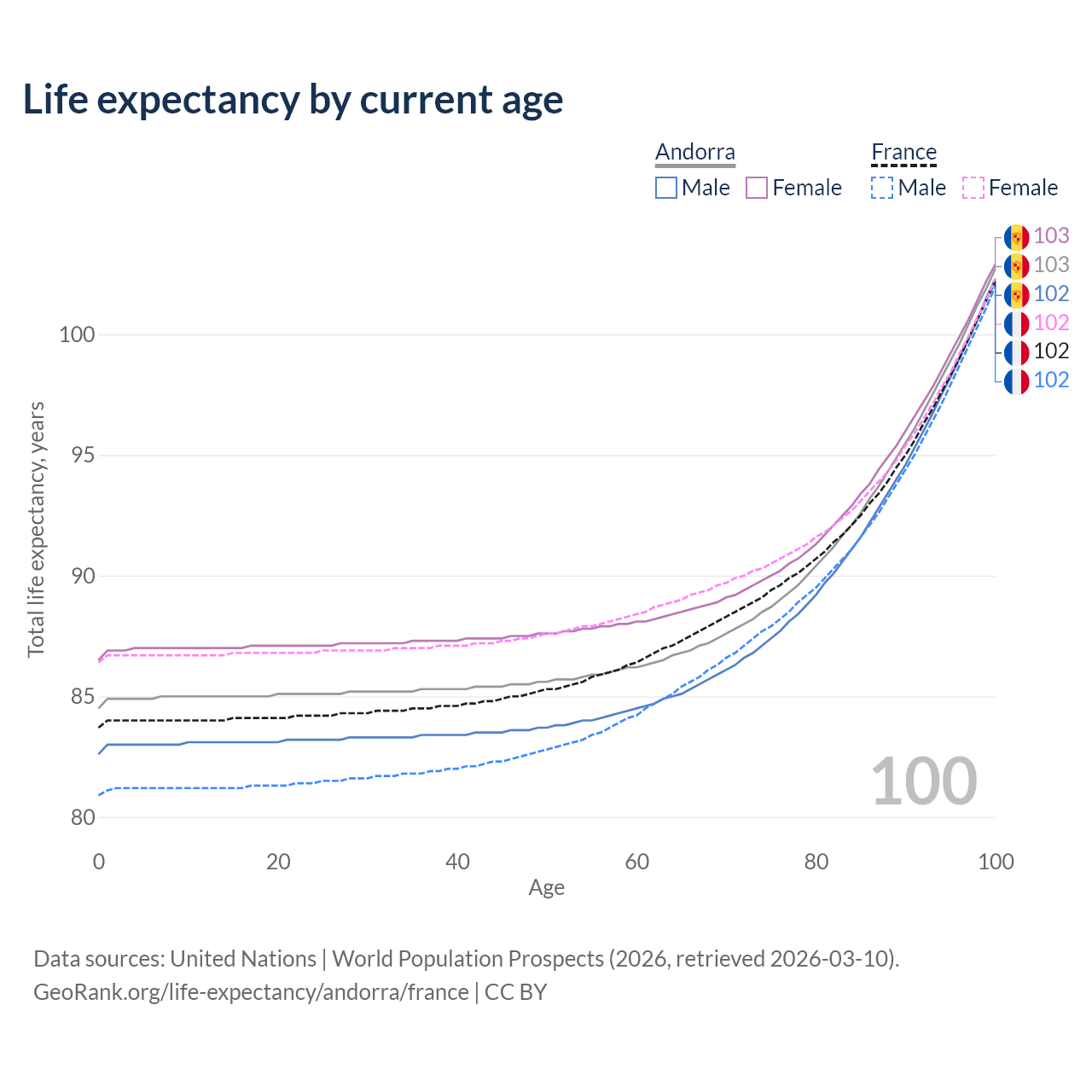 This life expectancy calculator shows the odds of living to 100, 95, 90, and below based on current age for both males and females in Andorra and France, along with mean and median age of death. The calculations are based on the 2026 life tables (actuarial tables) from the UN World Population Prospects.