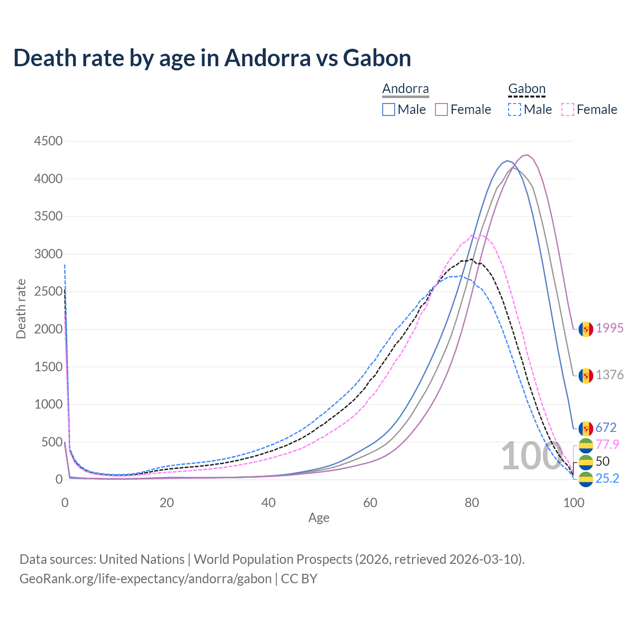 In Andorra, the most common age of death is 88, compared to 80 in Gabon. The median age of death is 86.6 in Andorra and 73.9 in Gabon, meaning only half of each cohort is expected to live past that age.