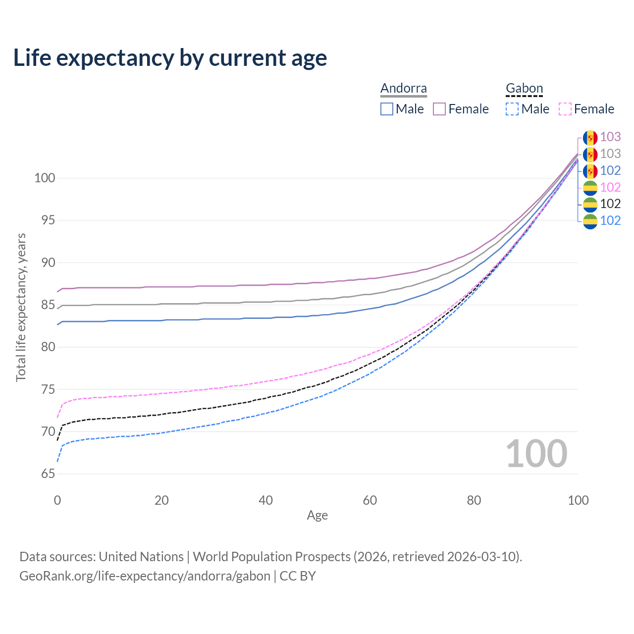 This life expectancy calculator shows the odds of living to 100, 95, 90, and below based on current age for both males and females in Andorra and Gabon, along with mean and median age of death. The calculations are based on the 2026 life tables (actuarial tables) from the UN World Population Prospects.