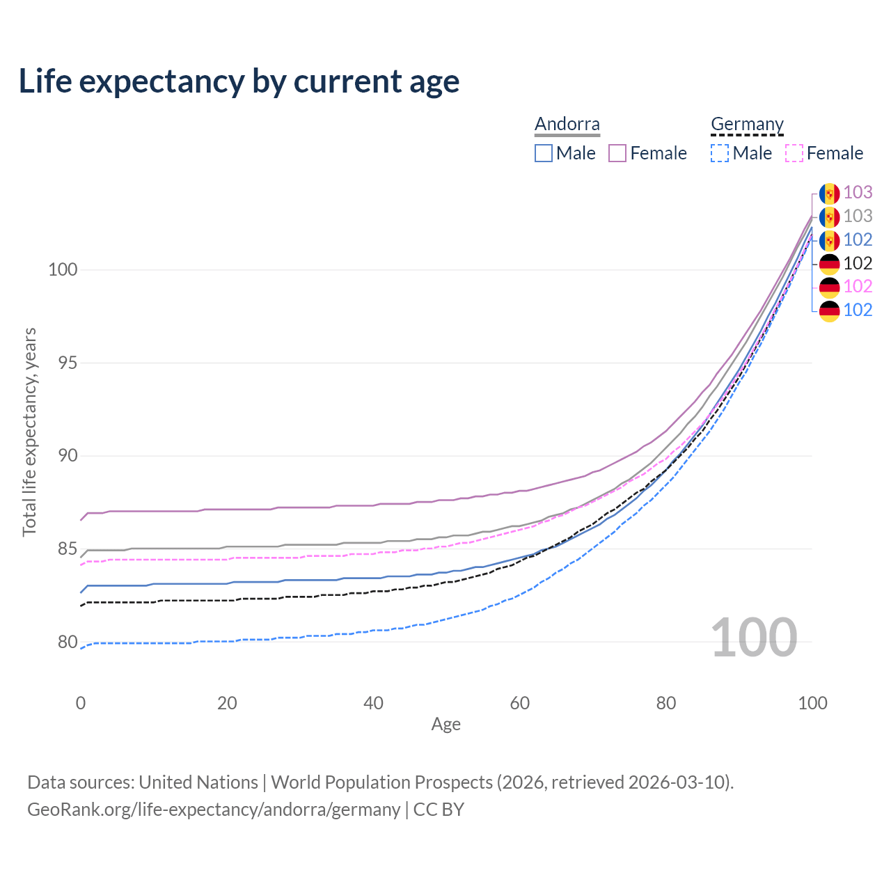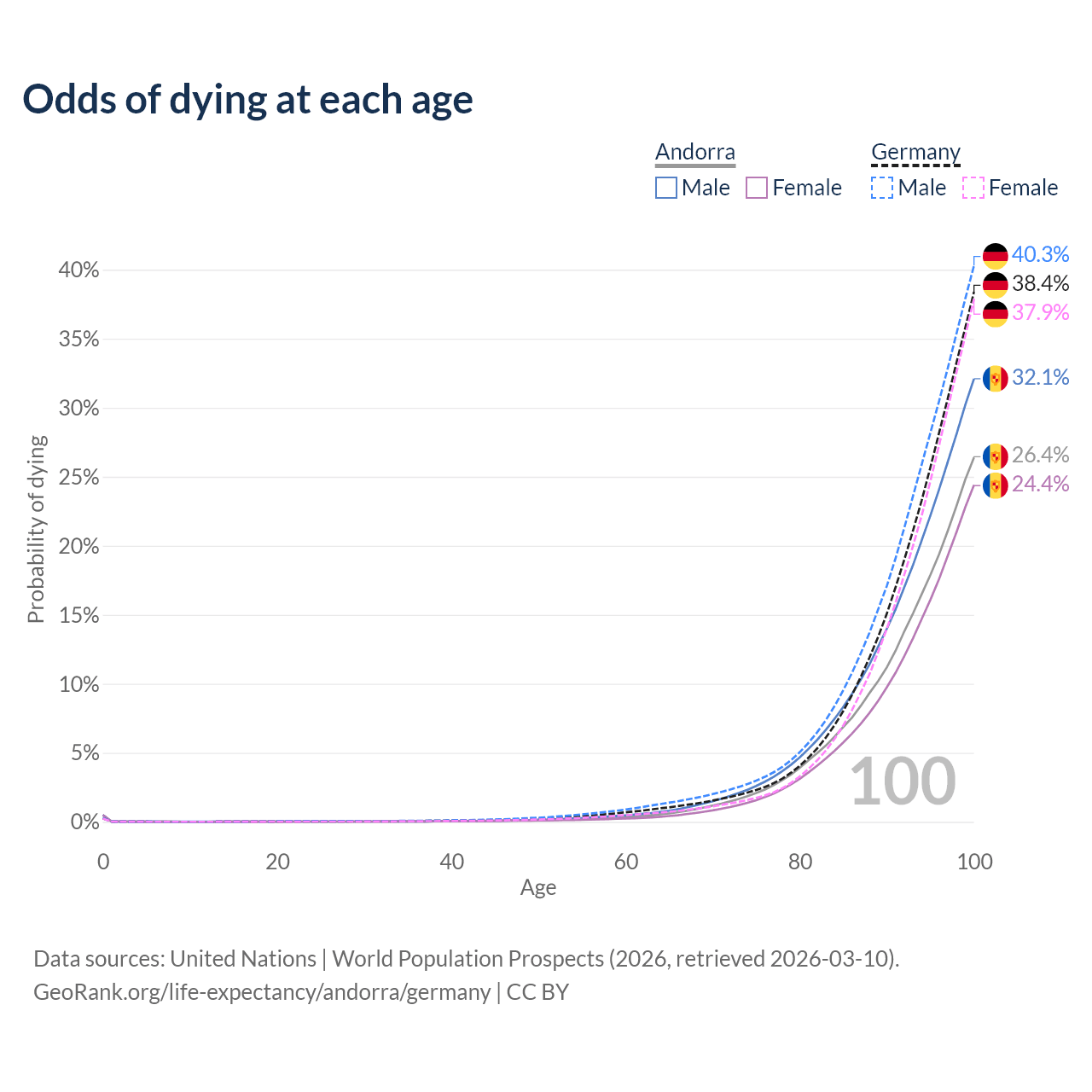 This life expectancy calculator shows the odds of living to 100, 95, 90, and below based on current age for both males and females in Andorra and Germany, along with mean and median age of death. The calculations are based on the 2026 life tables (actuarial tables) from the UN World Population Prospects.