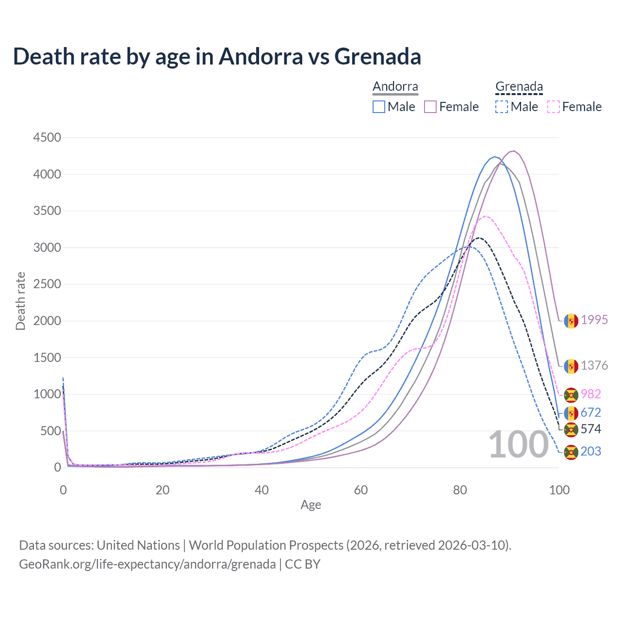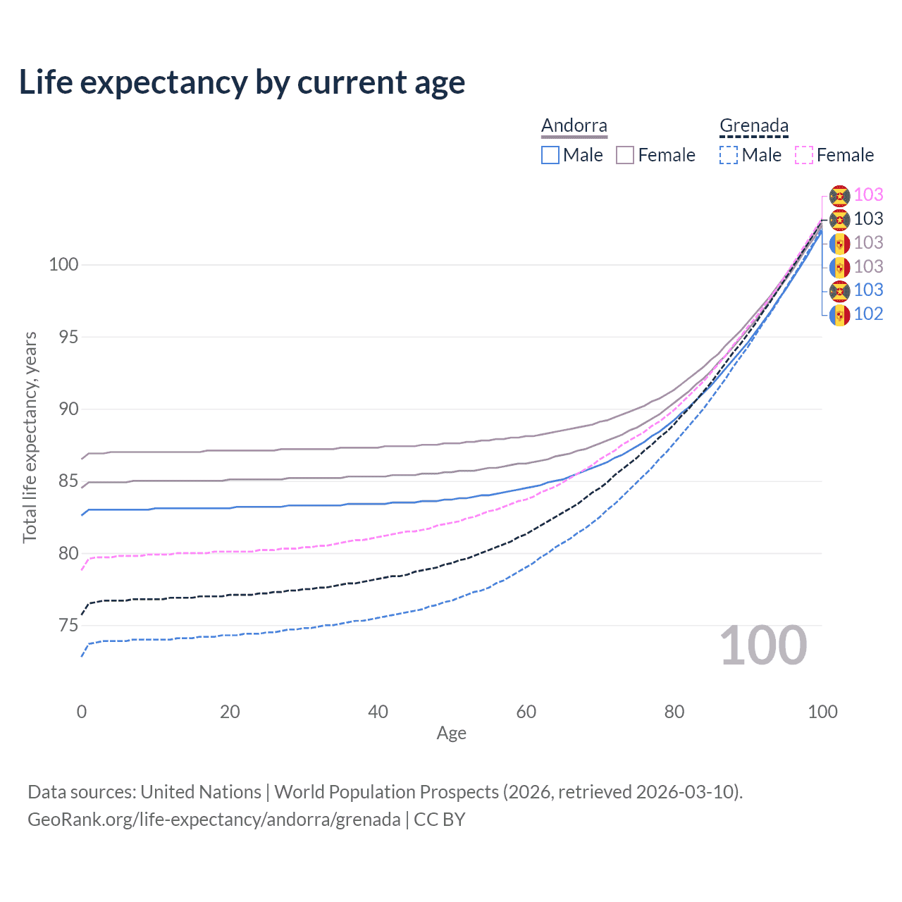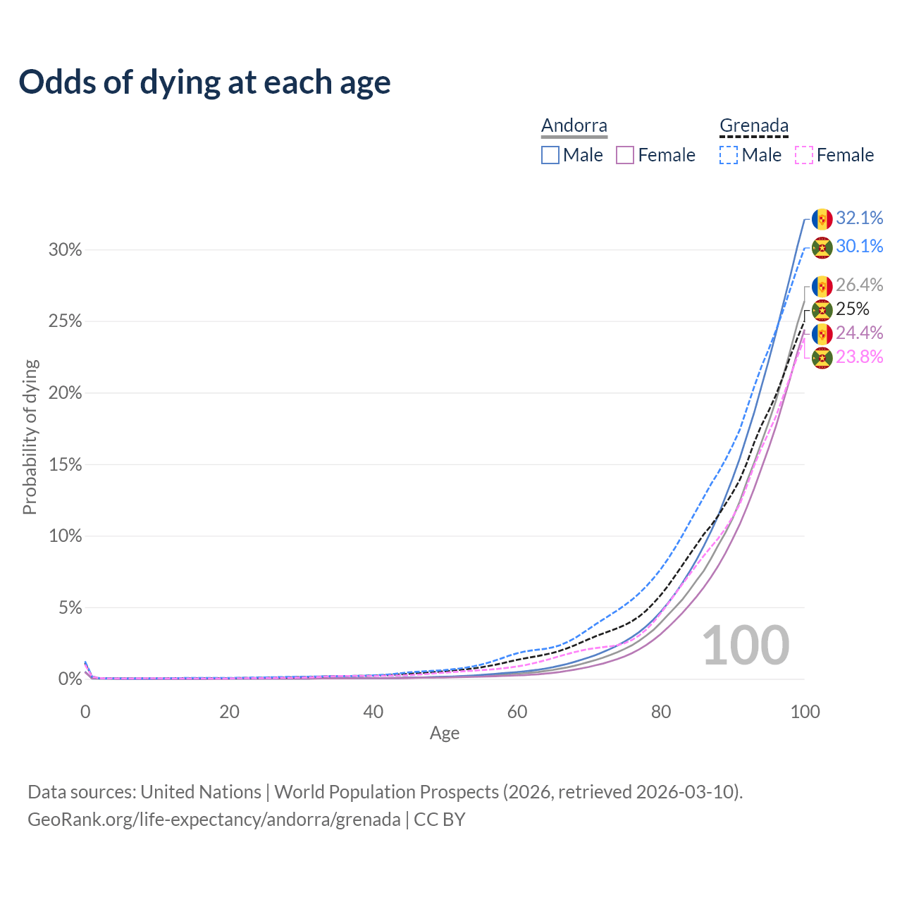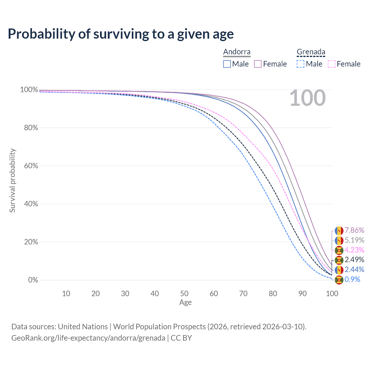 This life expectancy calculator shows the odds of living to 100, 95, 90, and below based on current age for both males and females in Andorra and Grenada, along with mean and median age of death. The calculations are based on the 2026 life tables (actuarial tables) from the UN World Population Prospects.