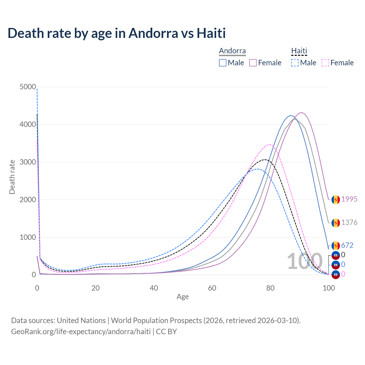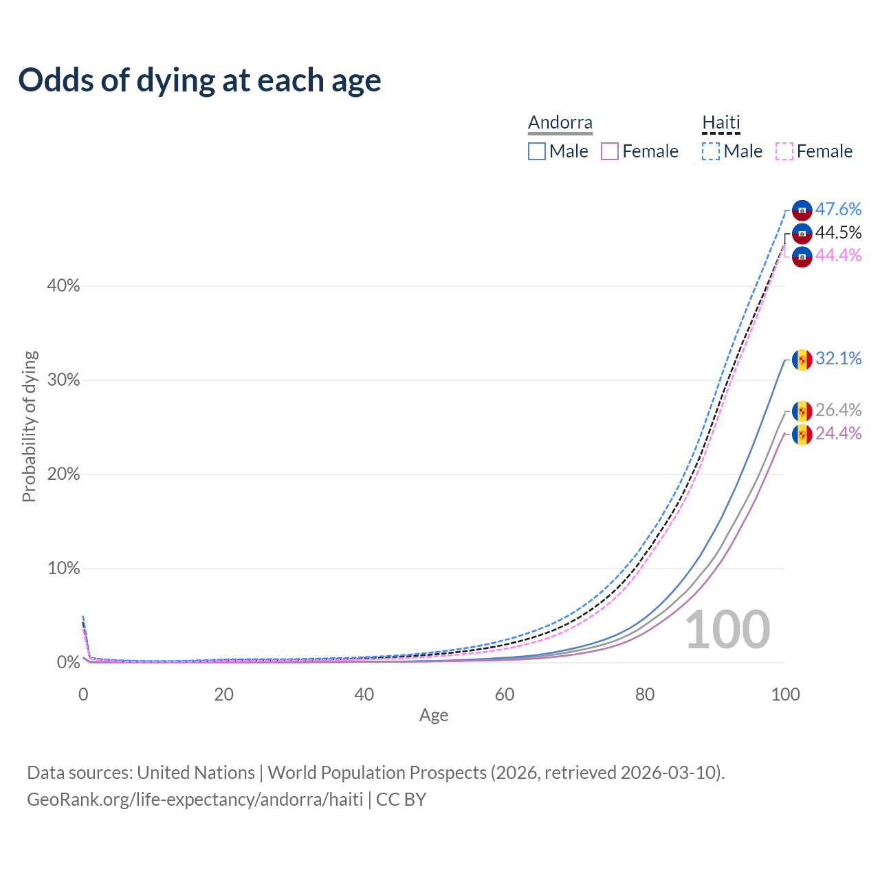 This life expectancy calculator shows the odds of living to 100, 95, 90, and below based on current age for both males and females in Andorra and Haiti, along with mean and median age of death. The calculations are based on the 2026 life tables (actuarial tables) from the UN World Population Prospects.