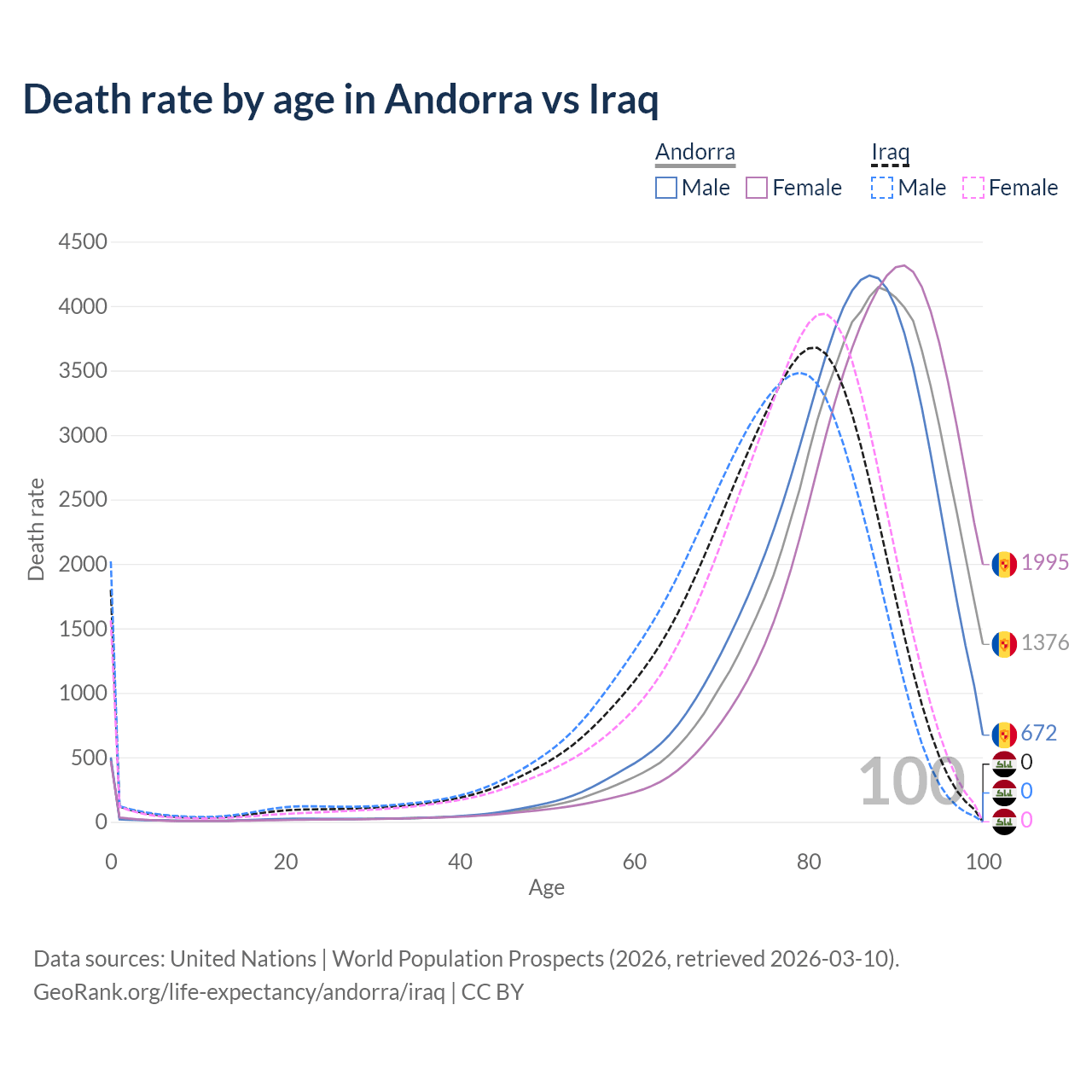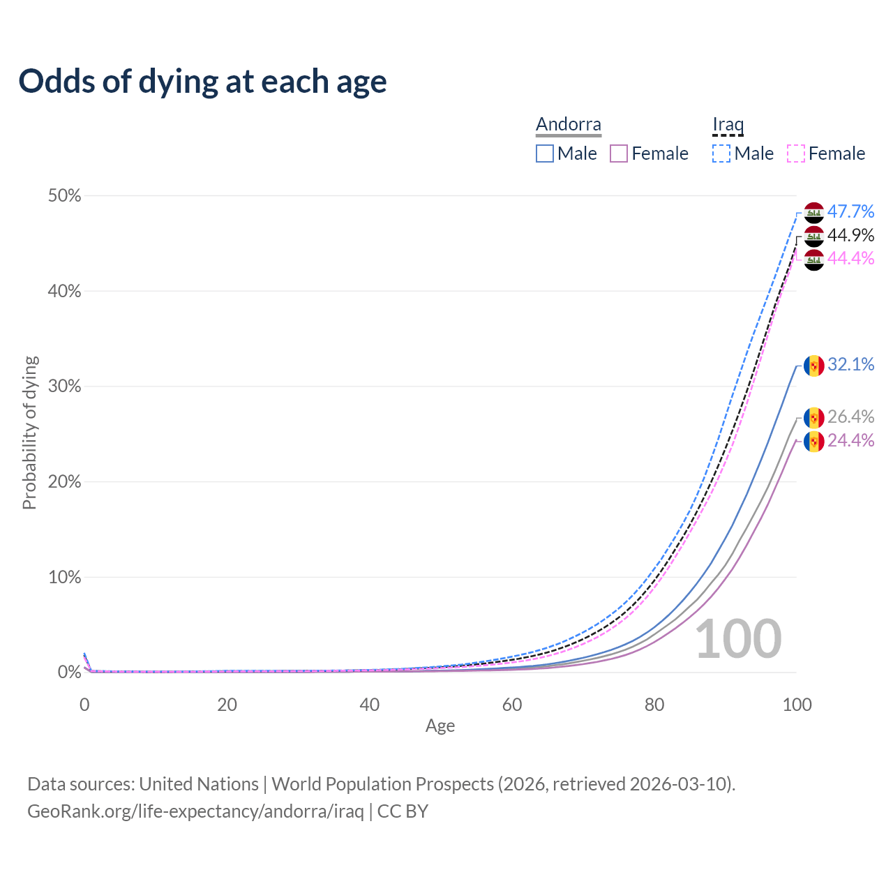 This life expectancy calculator shows the odds of living to 100, 95, 90, and below based on current age for both males and females in Andorra and Iraq, along with mean and median age of death. The calculations are based on the 2026 life tables (actuarial tables) from the UN World Population Prospects.