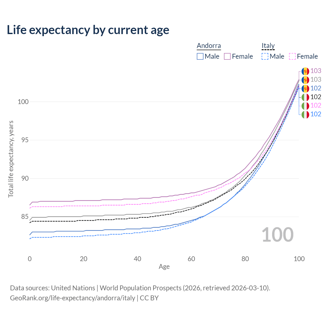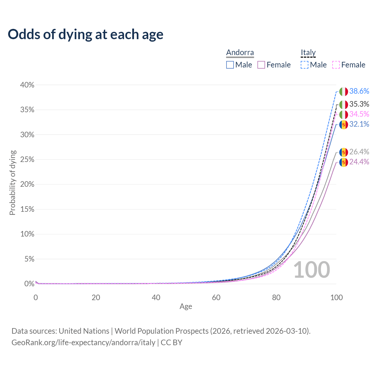 This life expectancy calculator shows the odds of living to 100, 95, 90, and below based on current age for both males and females in Andorra and Italy, along with mean and median age of death. The calculations are based on the 2026 life tables (actuarial tables) from the UN World Population Prospects.
