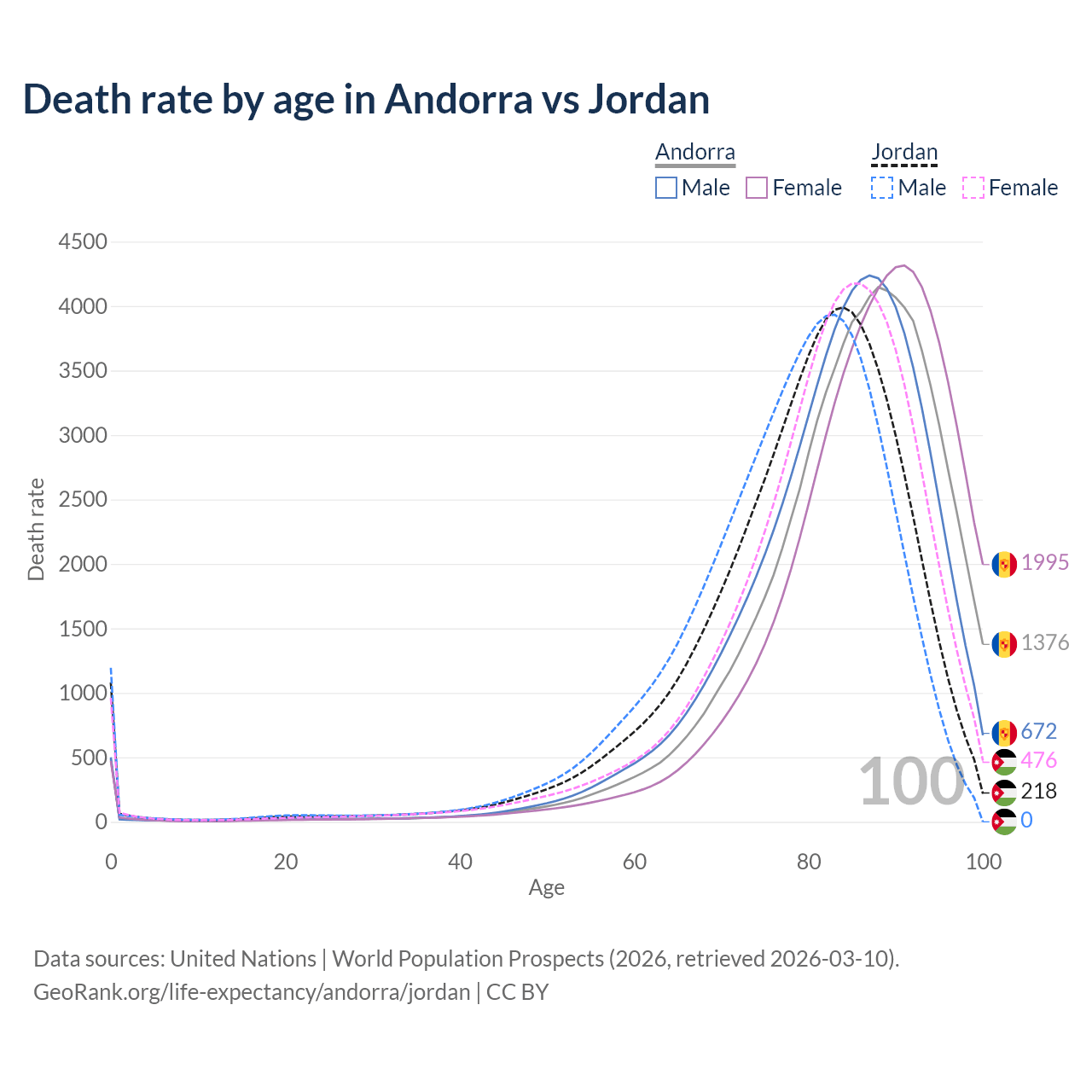 This life expectancy calculator shows the odds of living to 100, 95, 90, and below based on current age for both males and females in Andorra and Jordan, along with mean and median age of death. The calculations are based on the 2026 life tables (actuarial tables) from the UN World Population Prospects.