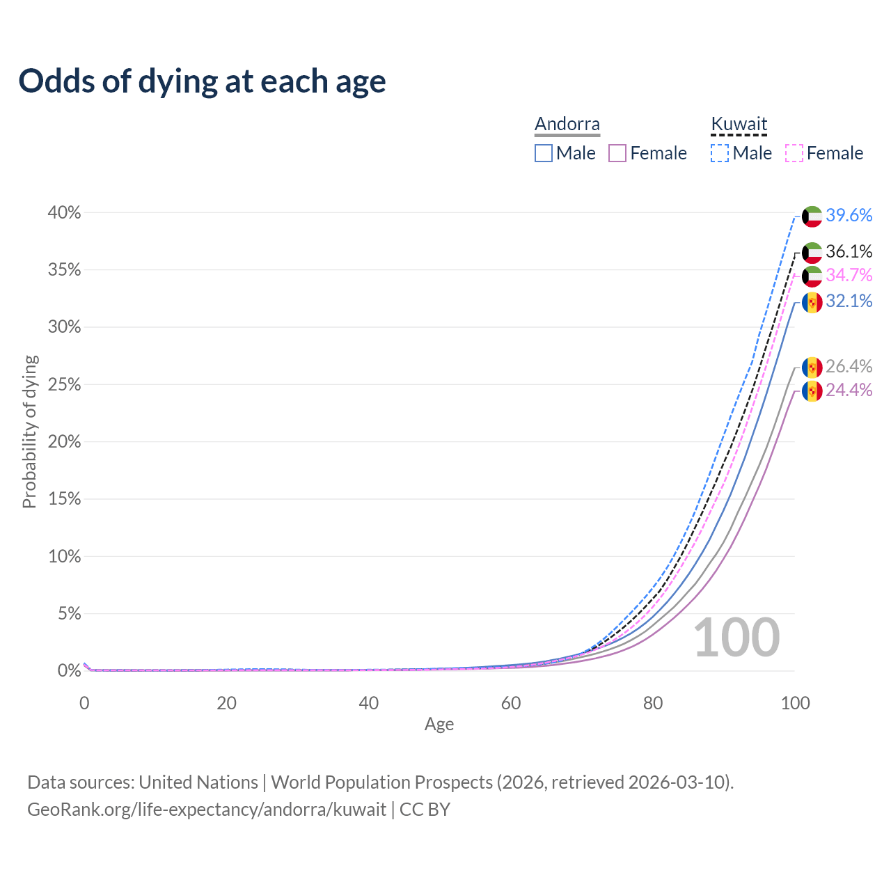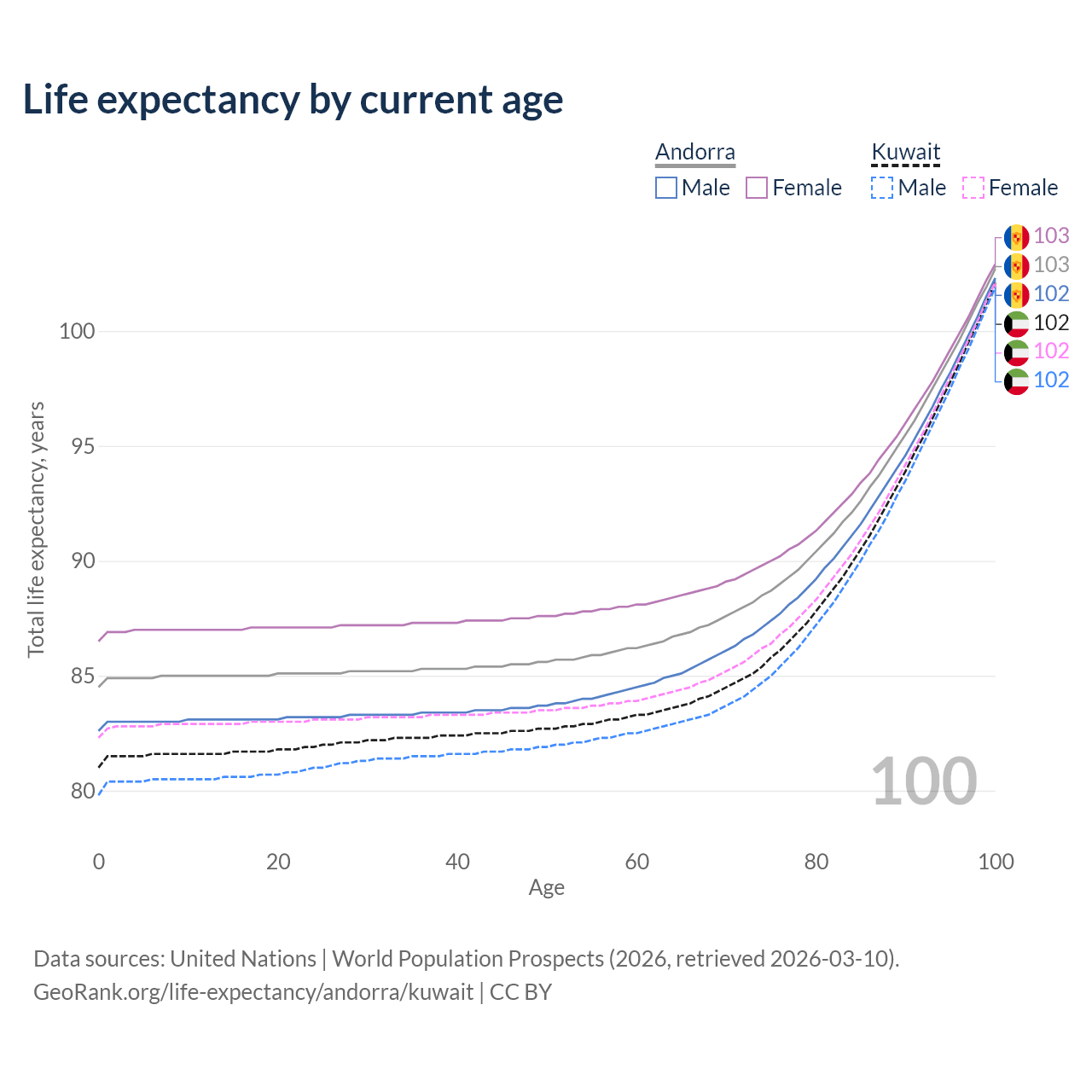 This life expectancy calculator shows the odds of living to 100, 95, 90, and below based on current age for both males and females in Andorra and Kuwait, along with mean and median age of death. The calculations are based on the 2026 life tables (actuarial tables) from the UN World Population Prospects.
