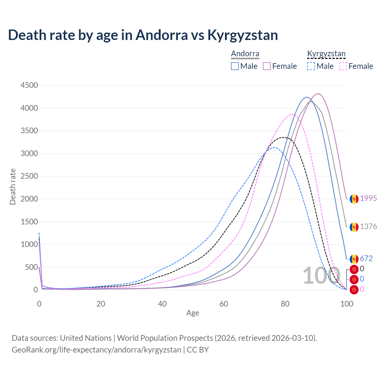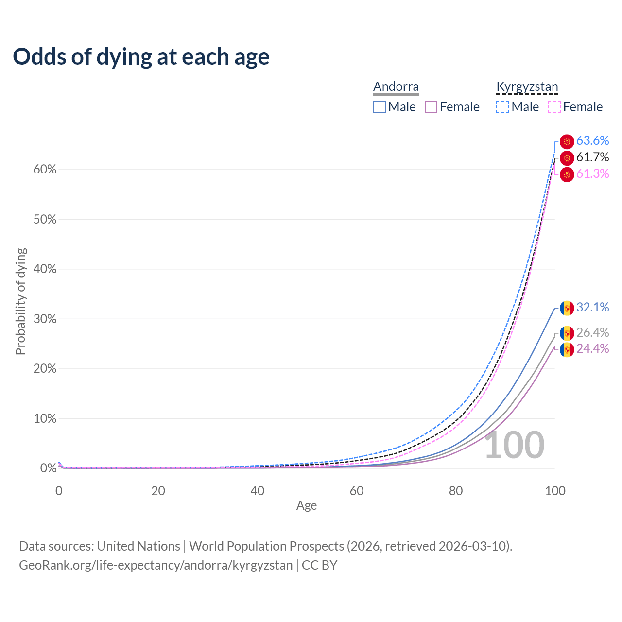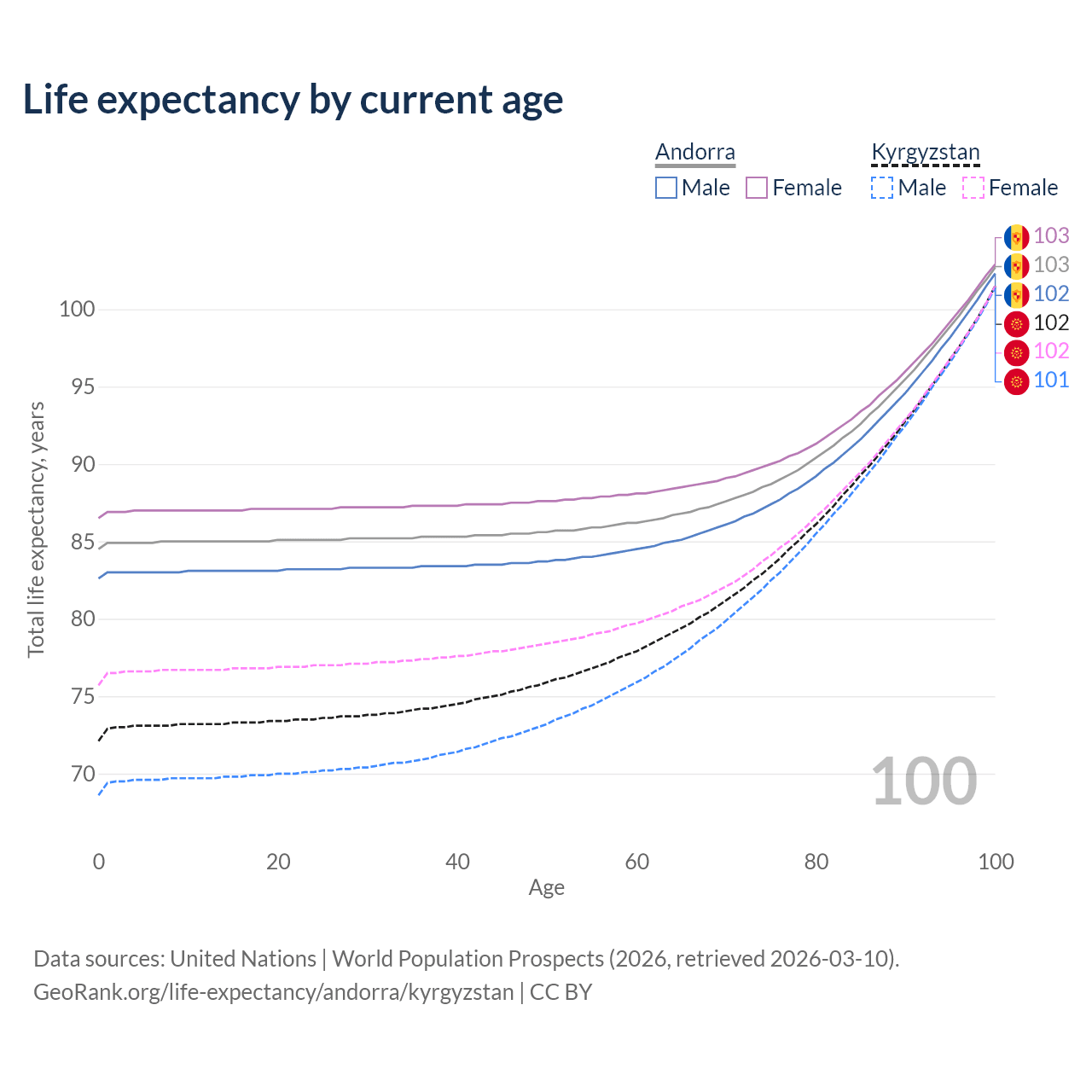 This life expectancy calculator shows the odds of living to 100, 95, 90, and below based on current age for both males and females in Andorra and Kyrgyzstan, along with mean and median age of death. The calculations are based on the 2026 life tables (actuarial tables) from the UN World Population Prospects.