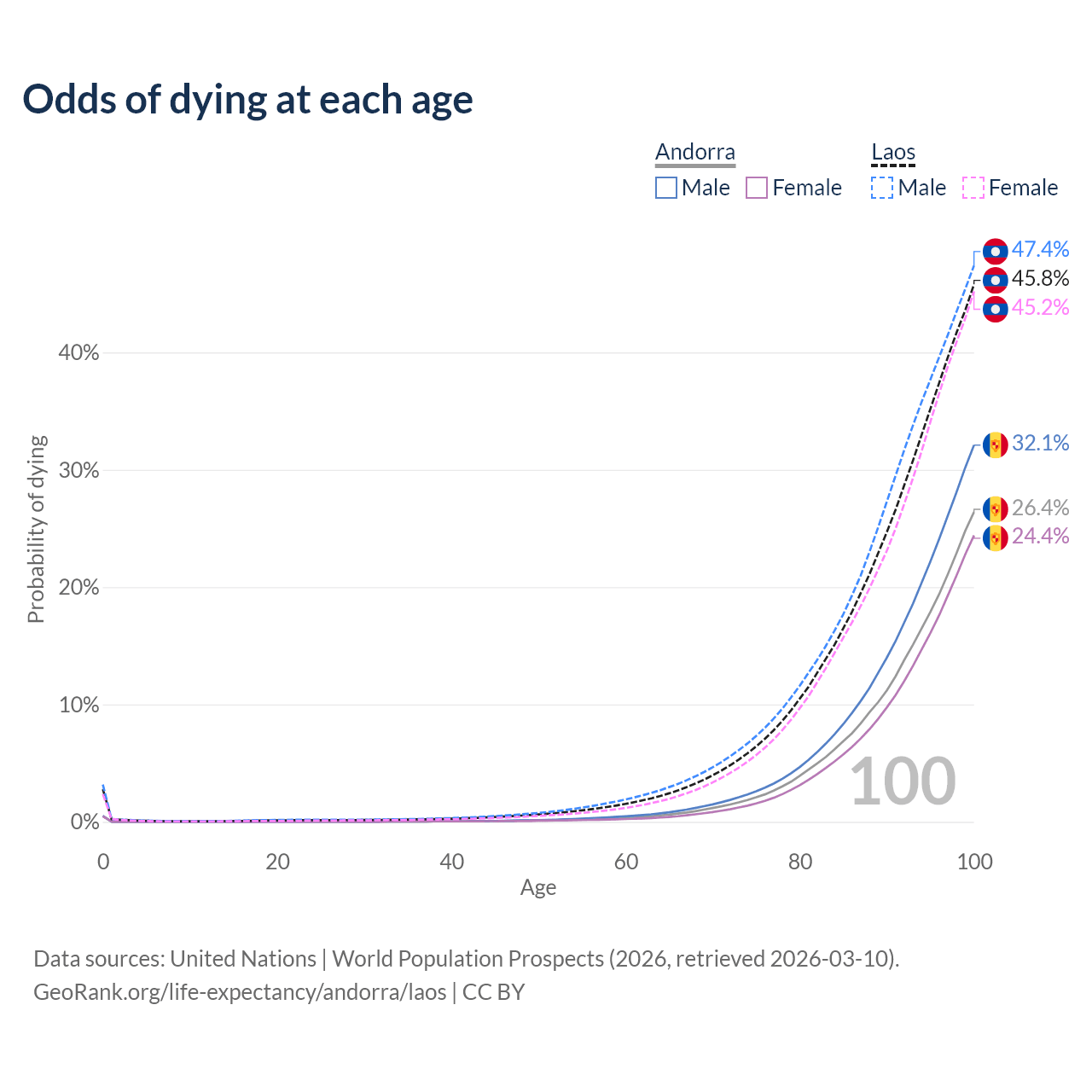 This life expectancy calculator shows the odds of living to 100, 95, 90, and below based on current age for both males and females in Andorra and Laos, along with mean and median age of death. The calculations are based on the 2026 life tables (actuarial tables) from the UN World Population Prospects.