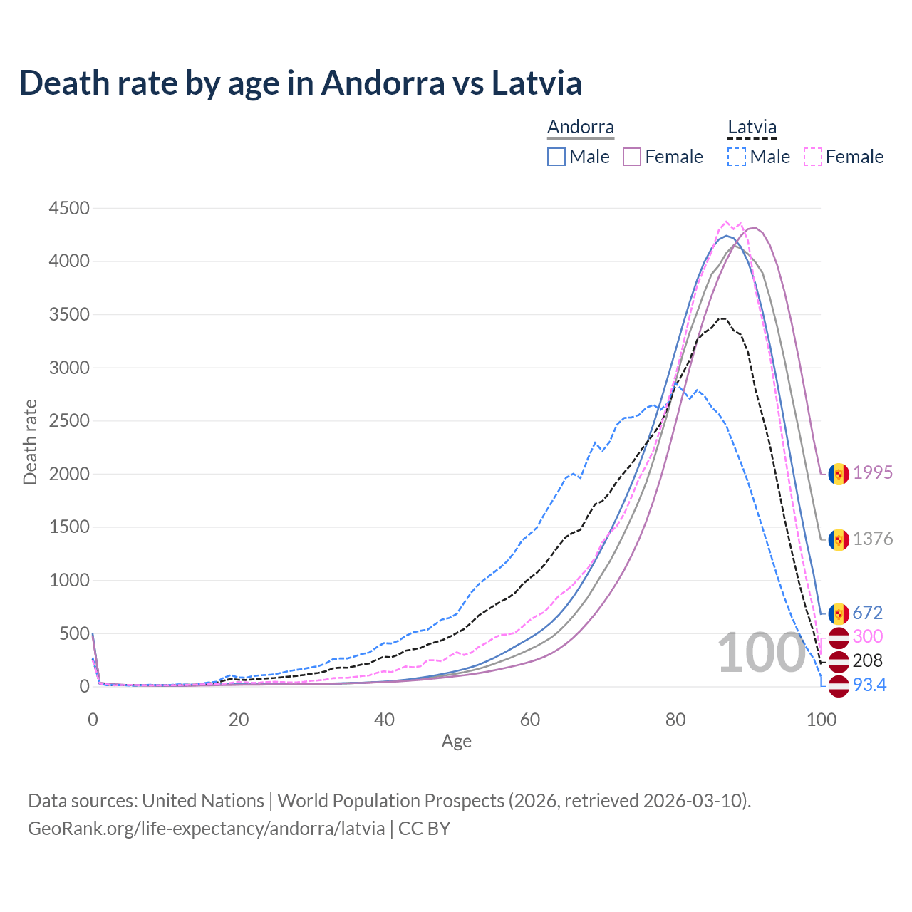 In Andorra, the most common age of death is 88, compared to 87 in Latvia. The median age of death is 86.6 in Andorra and 80.4 in Latvia, meaning only half of each cohort is expected to live past that age.