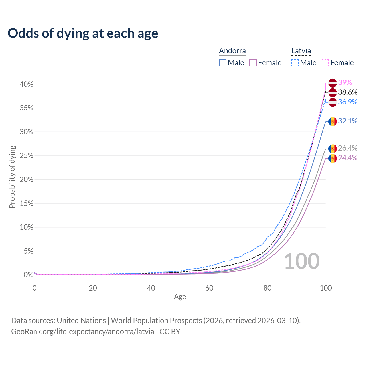 This life expectancy calculator shows the odds of living to 100, 95, 90, and below based on current age for both males and females in Andorra and Latvia, along with mean and median age of death. The calculations are based on the 2026 life tables (actuarial tables) from the UN World Population Prospects.