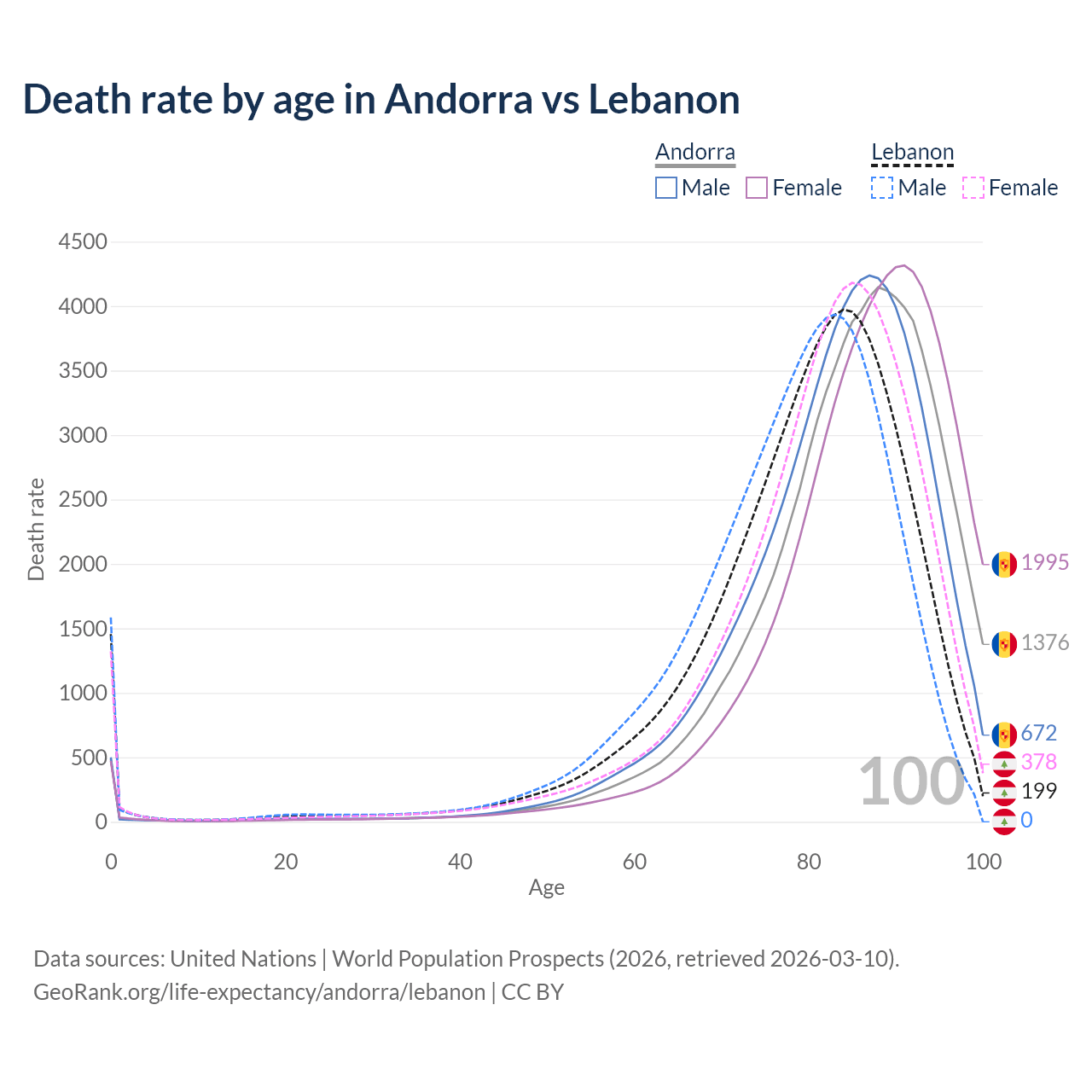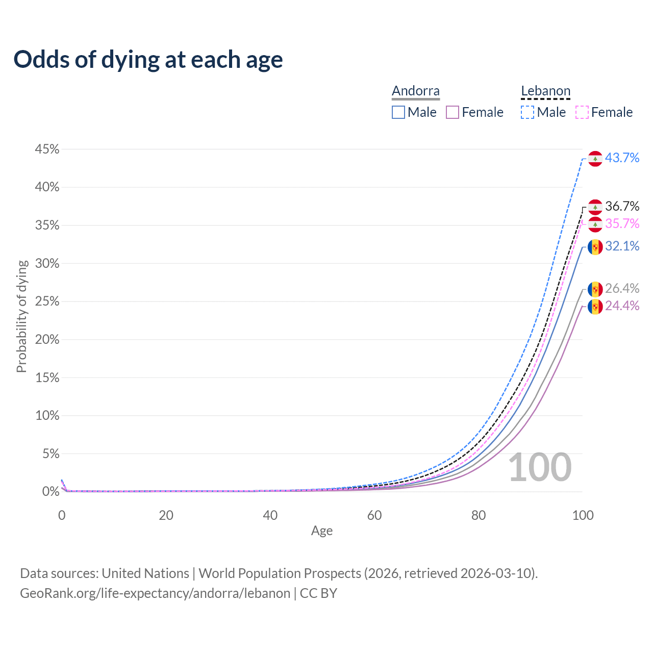 This life expectancy calculator shows the odds of living to 100, 95, 90, and below based on current age for both males and females in Andorra and Lebanon, along with mean and median age of death. The calculations are based on the 2026 life tables (actuarial tables) from the UN World Population Prospects.