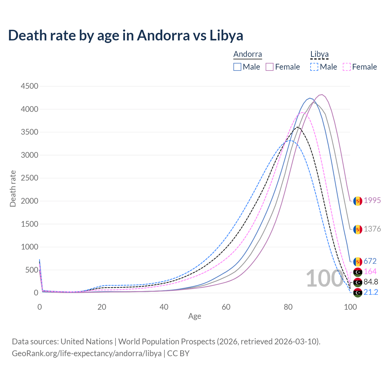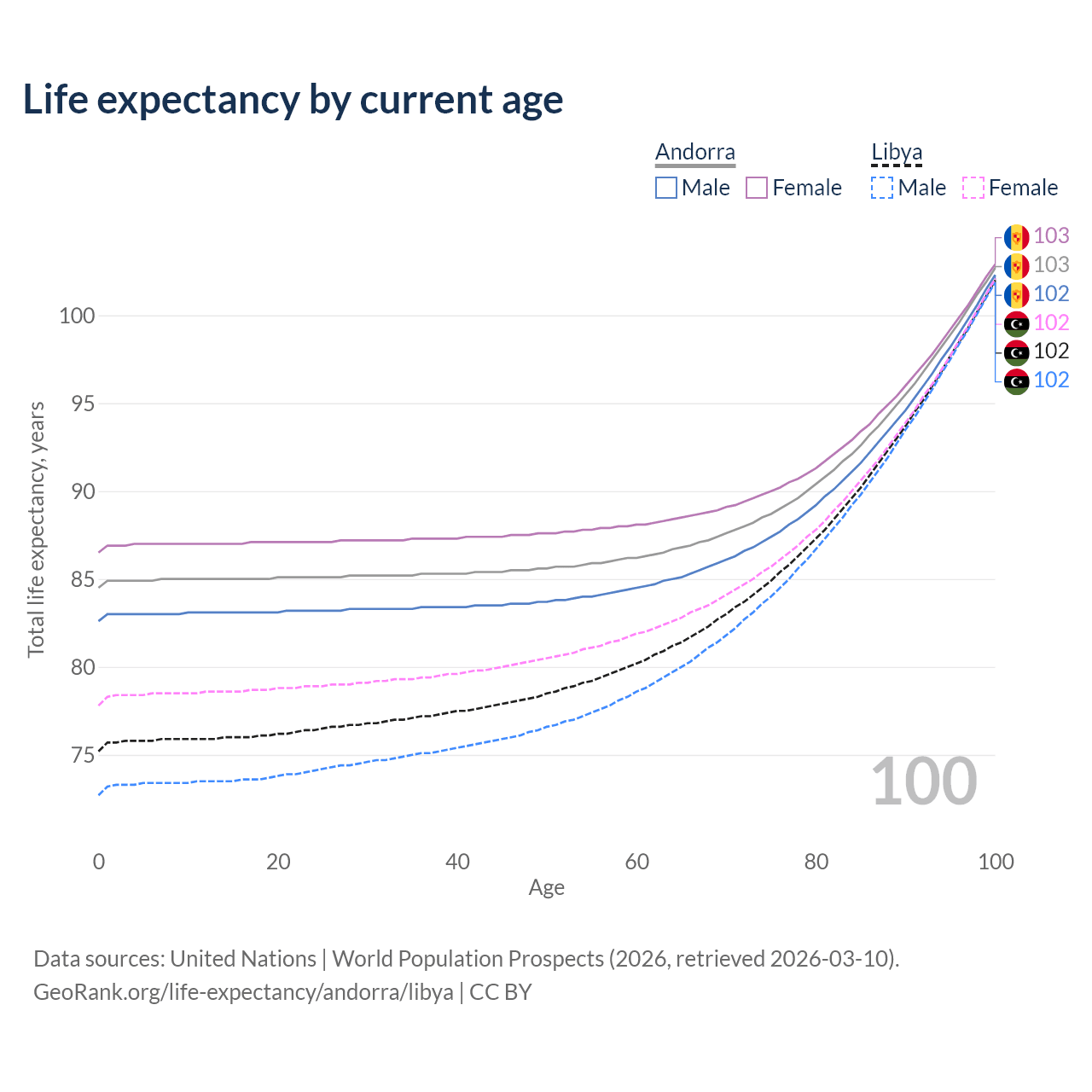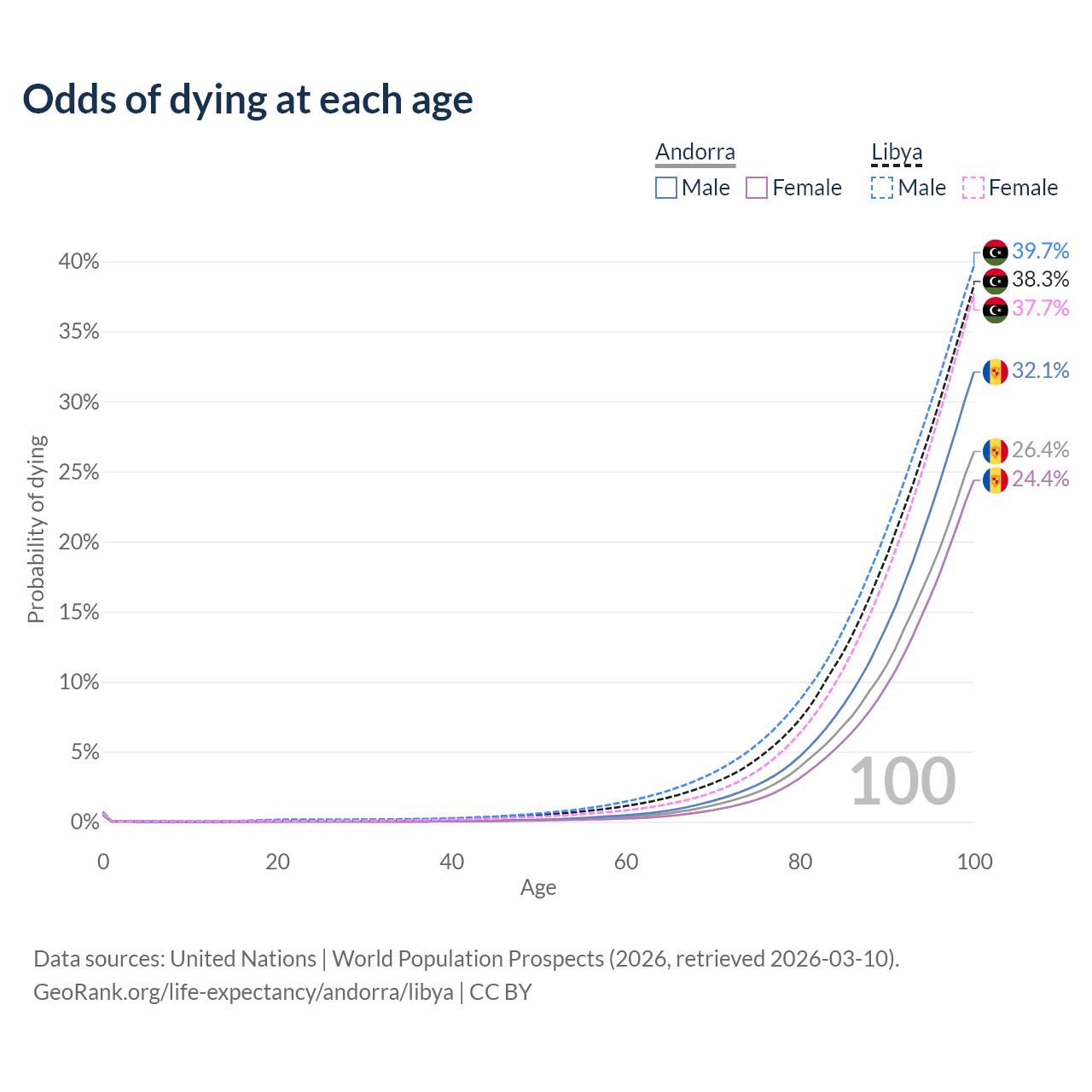 This life expectancy calculator shows the odds of living to 100, 95, 90, and below based on current age for both males and females in Andorra and Libya, along with mean and median age of death. The calculations are based on the 2026 life tables (actuarial tables) from the UN World Population Prospects.
