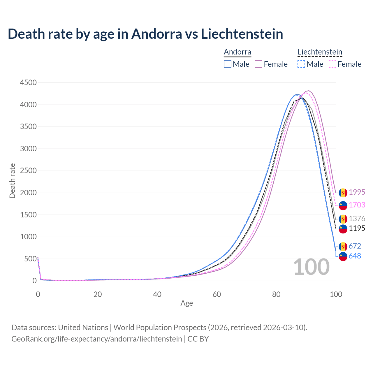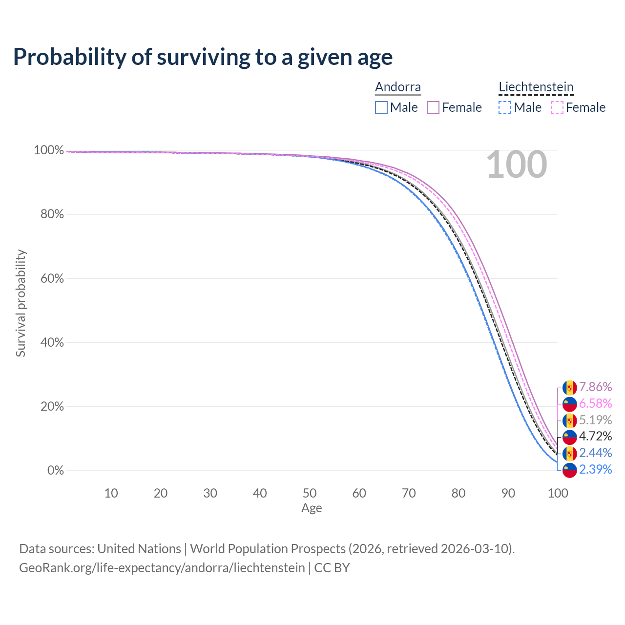 This life expectancy calculator shows the odds of living to 100, 95, 90, and below based on current age for both males and females in Andorra and Liechtenstein, along with mean and median age of death. The calculations are based on the 2026 life tables (actuarial tables) from the UN World Population Prospects.