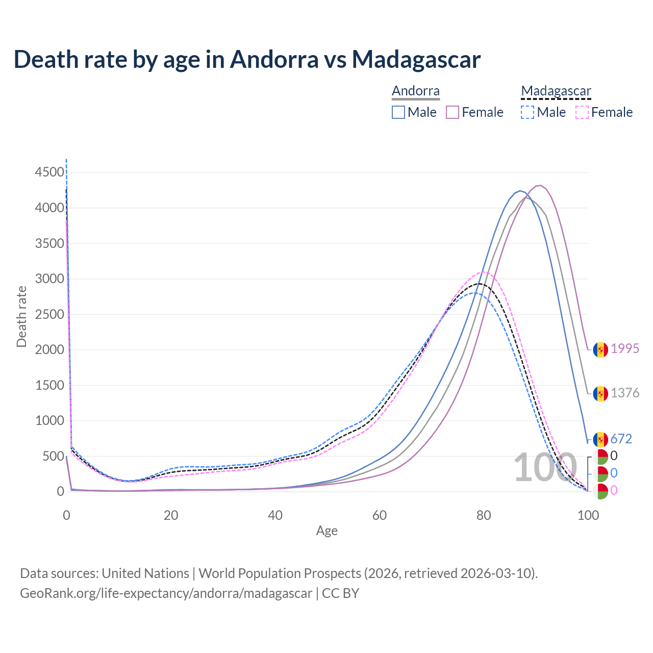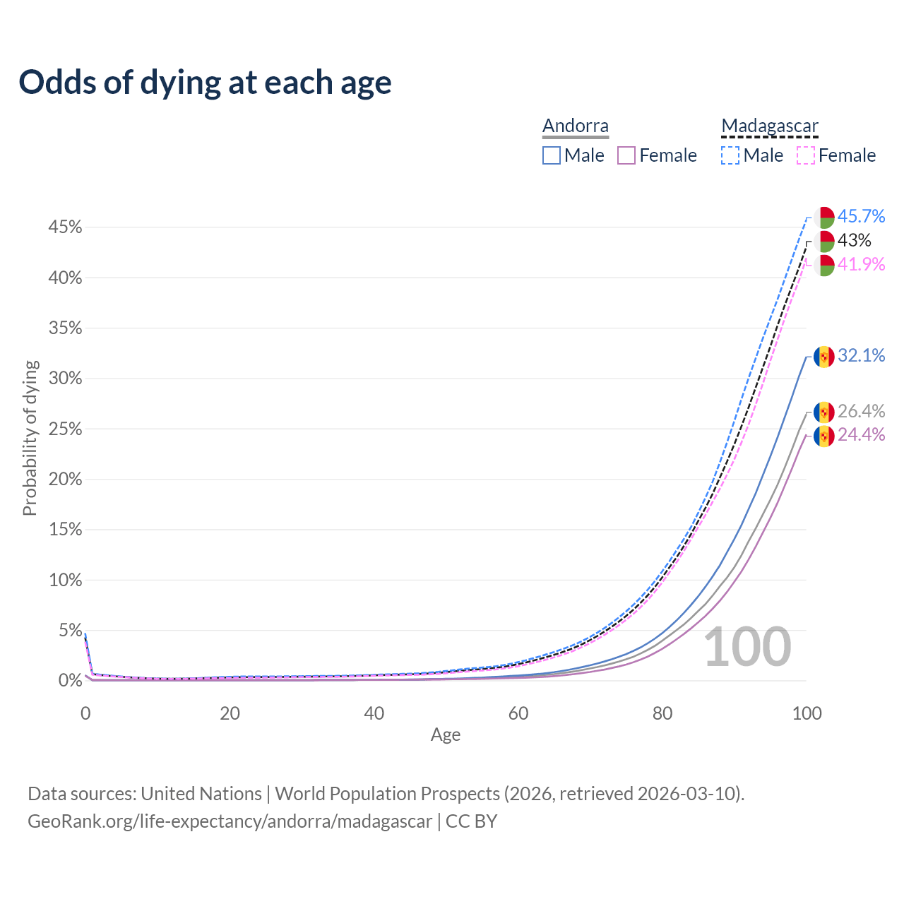 This life expectancy calculator shows the odds of living to 100, 95, 90, and below based on current age for both males and females in Andorra and Madagascar, along with mean and median age of death. The calculations are based on the 2026 life tables (actuarial tables) from the UN World Population Prospects.