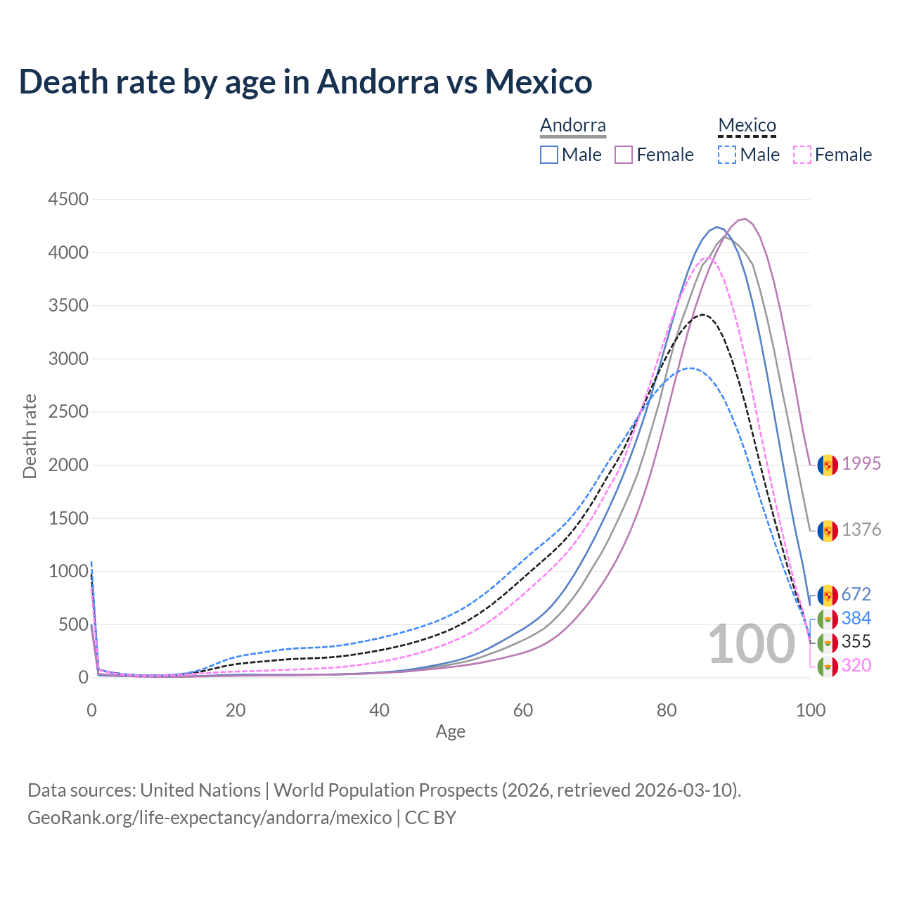 In Andorra, the most common age of death is 88, compared to 85 in Mexico. The median age of death is 86.6 in Andorra and 80.1 in Mexico, meaning only half of each cohort is expected to live past that age.