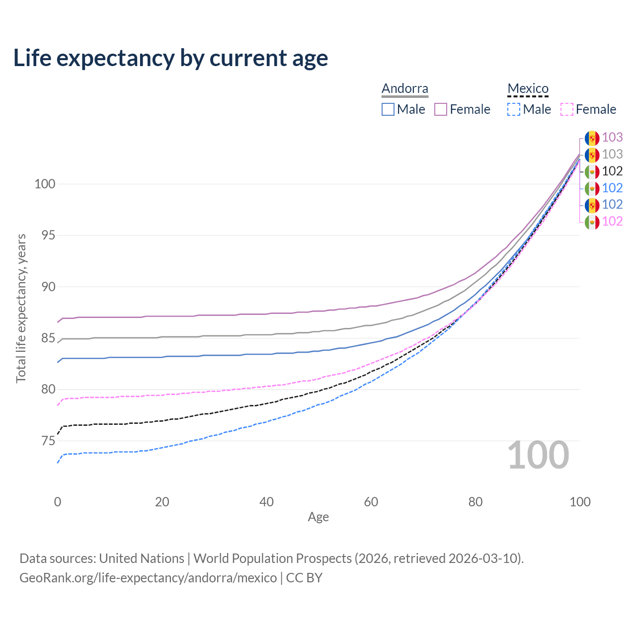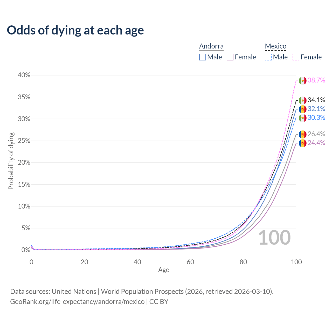 This life expectancy calculator shows the odds of living to 100, 95, 90, and below based on current age for both males and females in Andorra and Mexico, along with mean and median age of death. The calculations are based on the 2026 life tables (actuarial tables) from the UN World Population Prospects.
