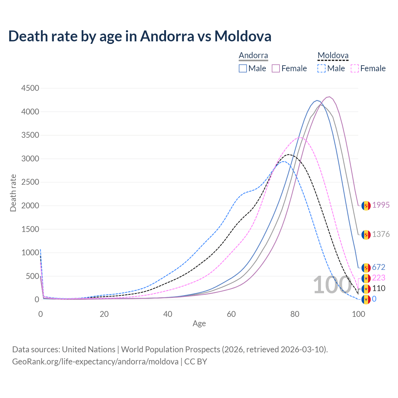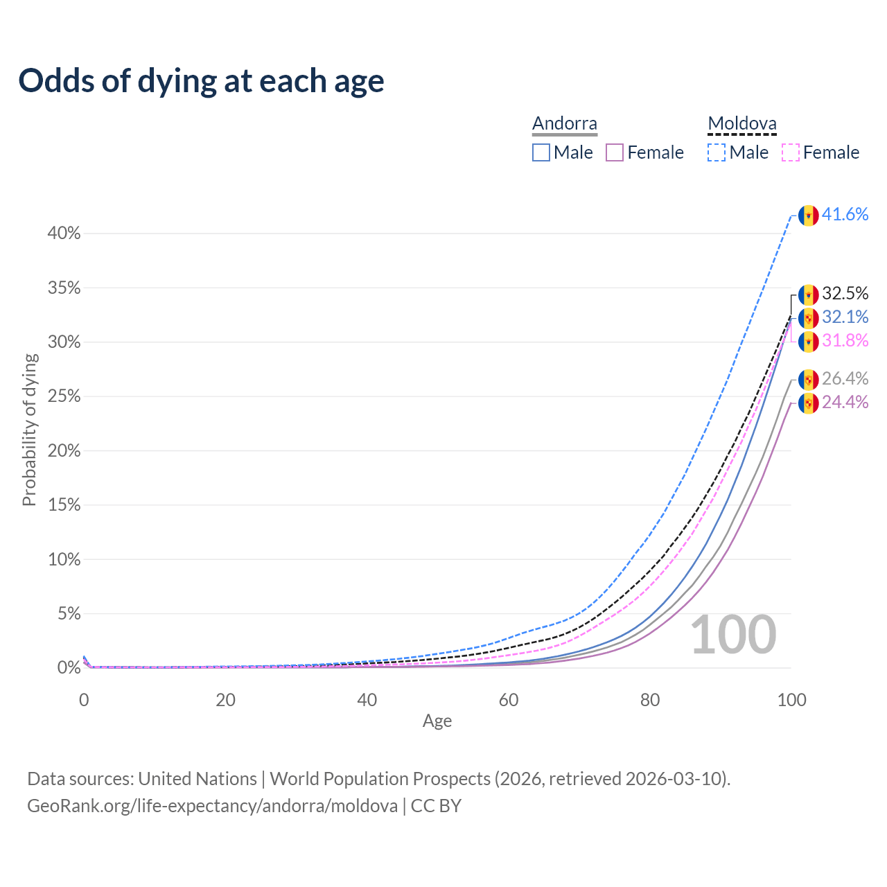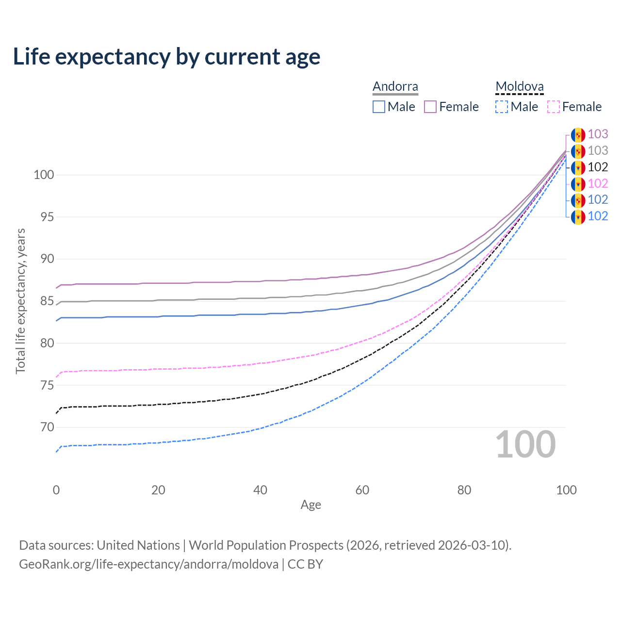 This life expectancy calculator shows the odds of living to 100, 95, 90, and below based on current age for both males and females in Andorra and Moldova, along with mean and median age of death. The calculations are based on the 2026 life tables (actuarial tables) from the UN World Population Prospects.
