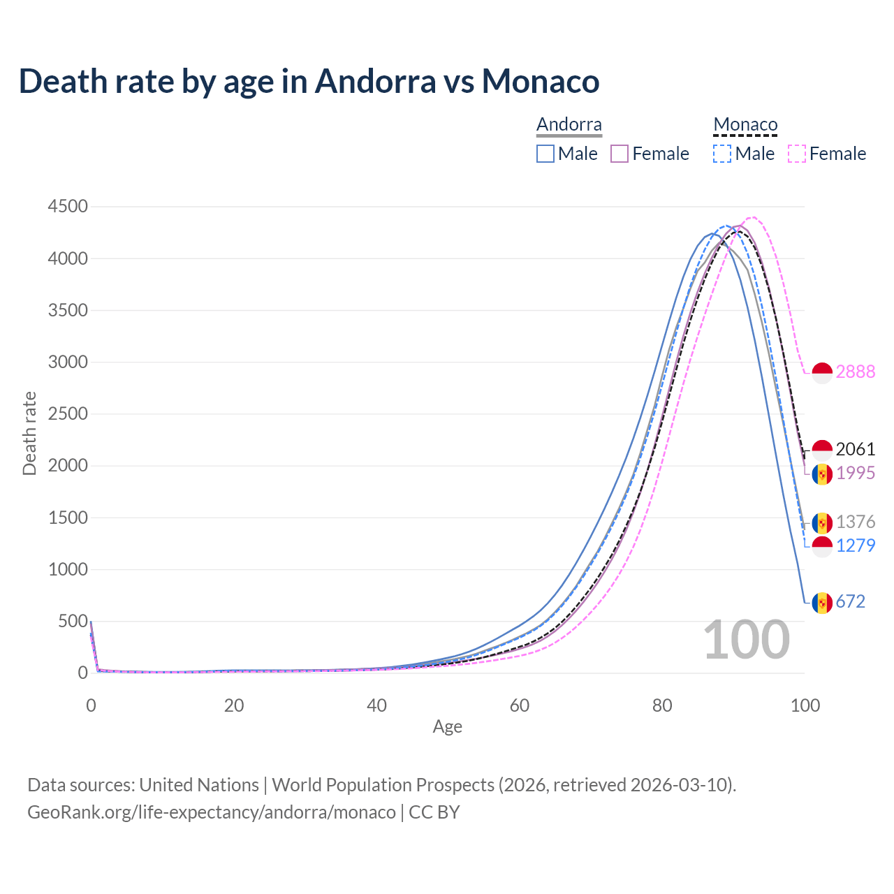 This life expectancy calculator shows the odds of living to 100, 95, 90, and below based on current age for both males and females in Andorra and Monaco, along with mean and median age of death. The calculations are based on the 2026 life tables (actuarial tables) from the UN World Population Prospects.