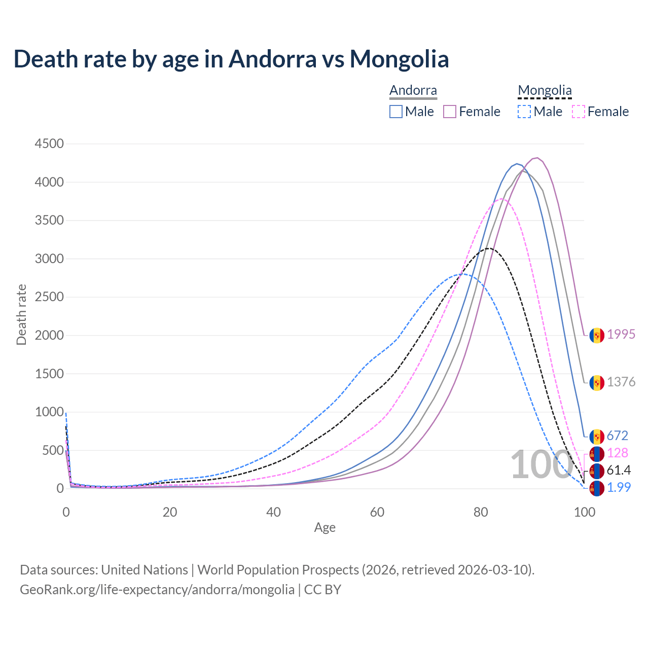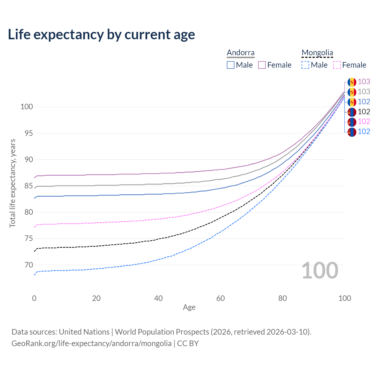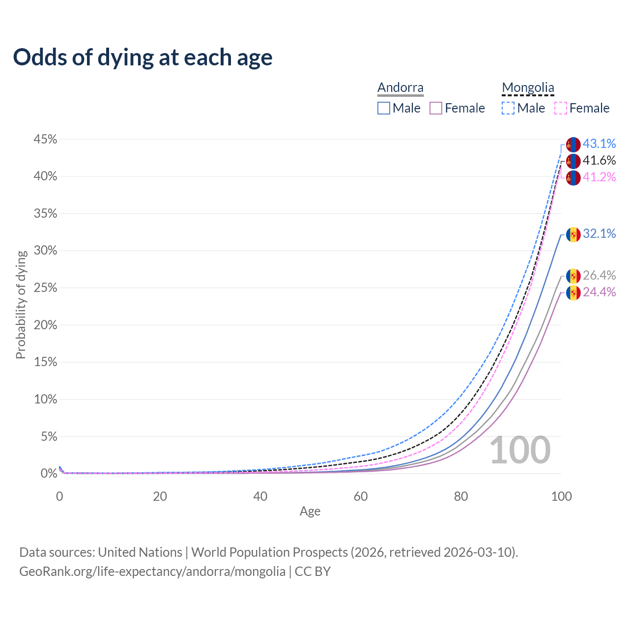 This life expectancy calculator shows the odds of living to 100, 95, 90, and below based on current age for both males and females in Andorra and Mongolia, along with mean and median age of death. The calculations are based on the 2026 life tables (actuarial tables) from the UN World Population Prospects.
