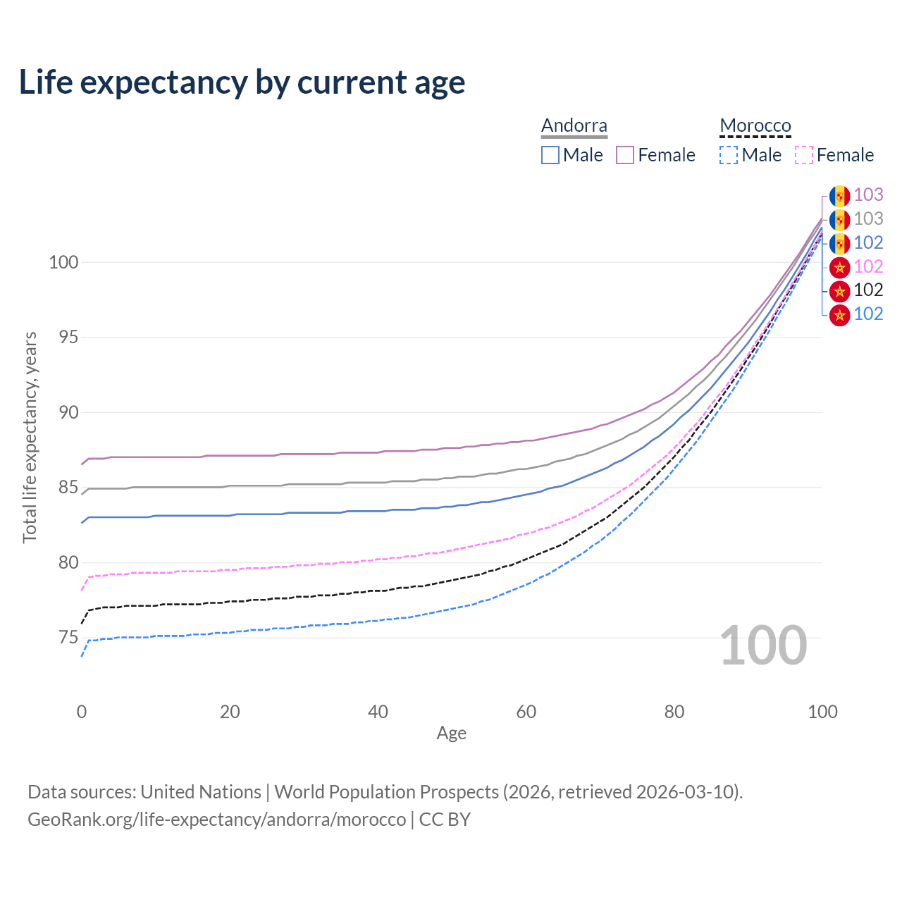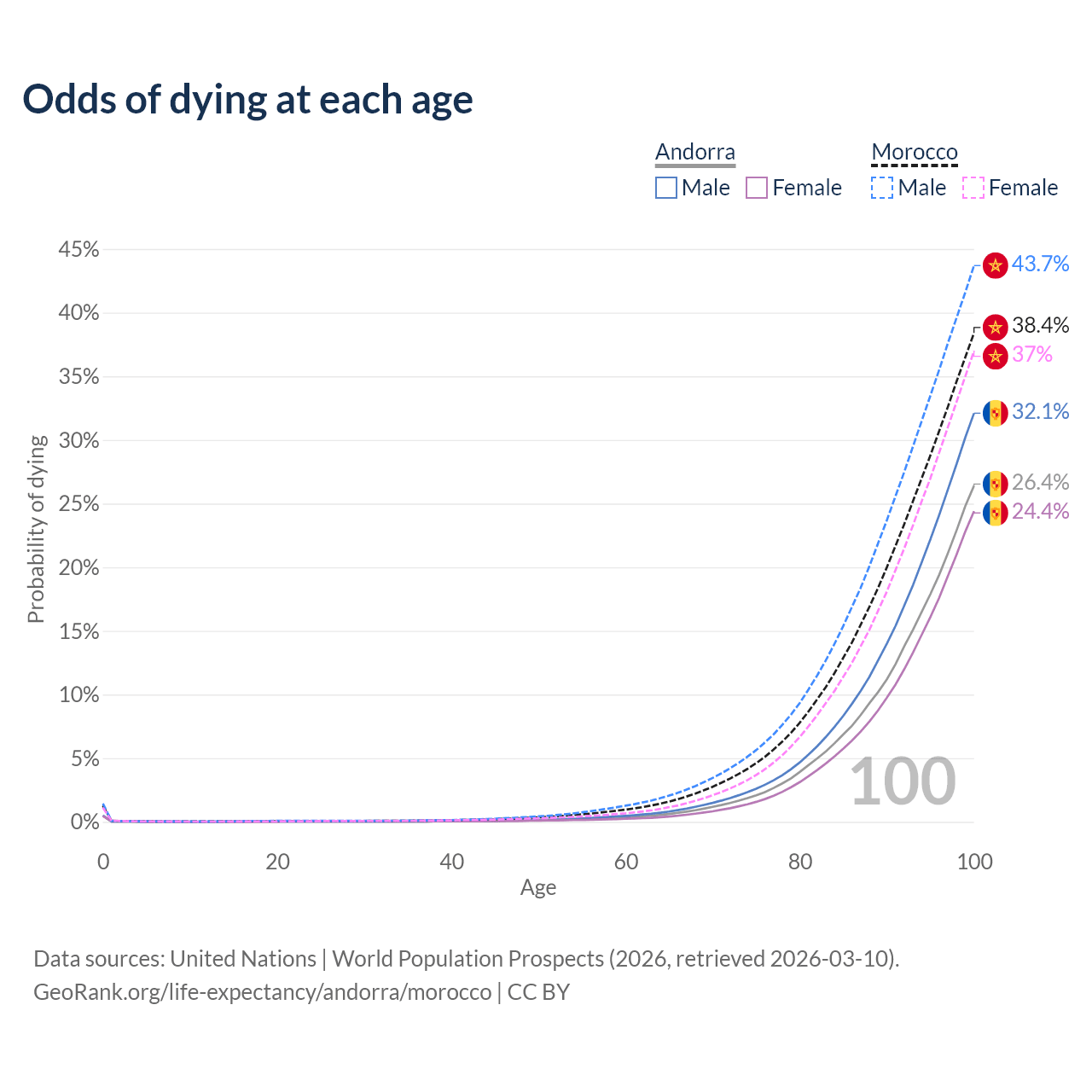 This life expectancy calculator shows the odds of living to 100, 95, 90, and below based on current age for both males and females in Andorra and Morocco, along with mean and median age of death. The calculations are based on the 2026 life tables (actuarial tables) from the UN World Population Prospects.
