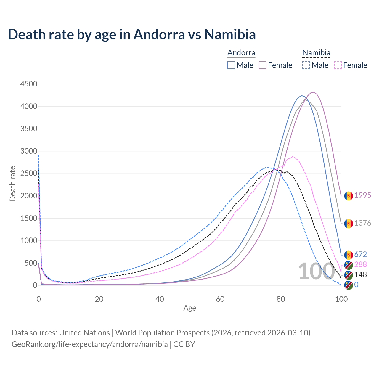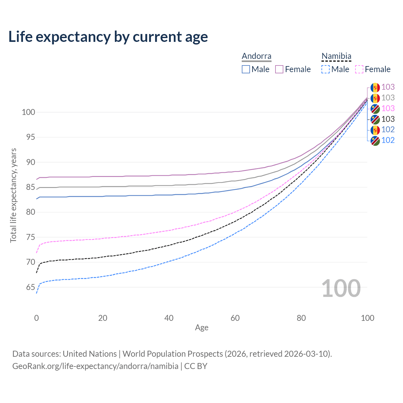 The average life expectancy at birth is 84.5 years in Andorra vs 67.8 in Namibia. Andorra is ranked 5/197 by life expectancy, and Namibia is 153/197. In Andorra, the life expectancy is 82.6 years for males and 86.5 years for females. In Namibia, it's 63.7 years for males and 71.8 years for females.