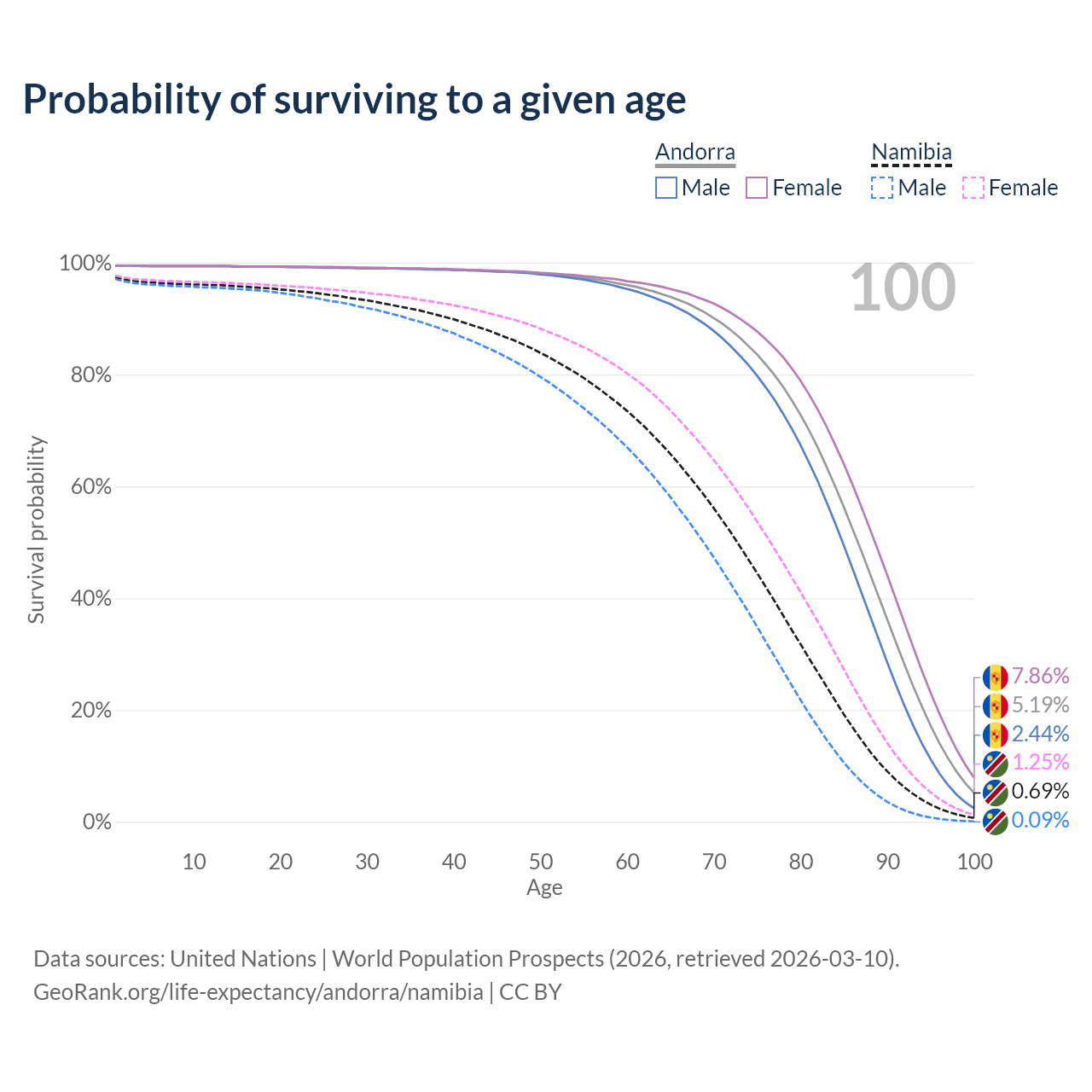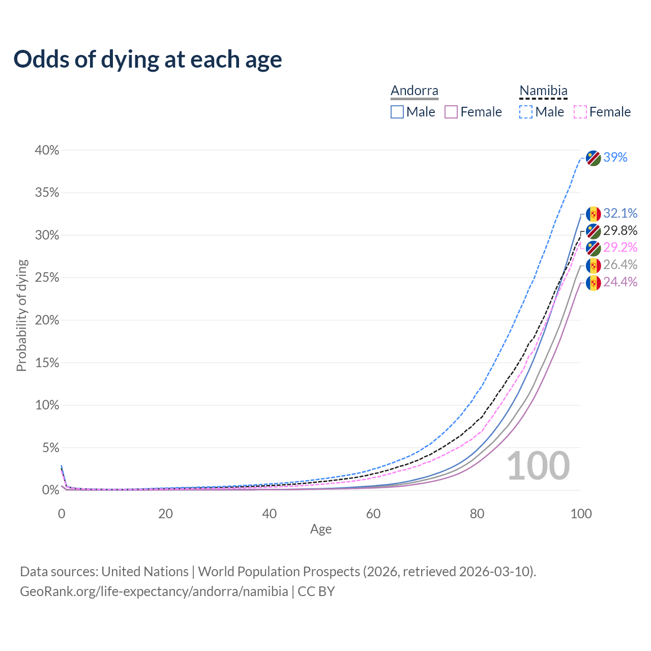 This life expectancy calculator shows the odds of living to 100, 95, 90, and below based on current age for both males and females in Andorra and Namibia, along with mean and median age of death. The calculations are based on the 2026 life tables (actuarial tables) from the UN World Population Prospects.