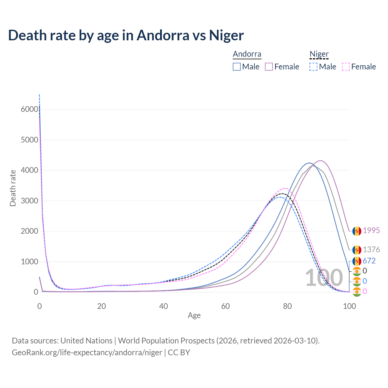 In Andorra, the most common age of death is 88, compared to 0 in Niger. The median age of death is 86.6 in Andorra and 71.7 in Niger, meaning only half of each cohort is expected to live past that age.