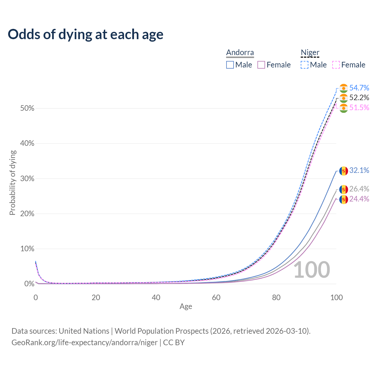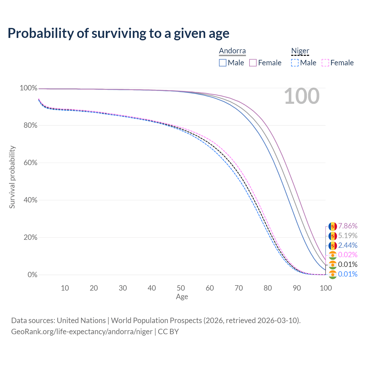 This life expectancy calculator shows the odds of living to 100, 95, 90, and below based on current age for both males and females in Andorra and Niger, along with mean and median age of death. The calculations are based on the 2026 life tables (actuarial tables) from the UN World Population Prospects.