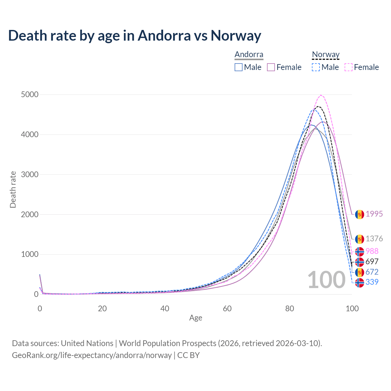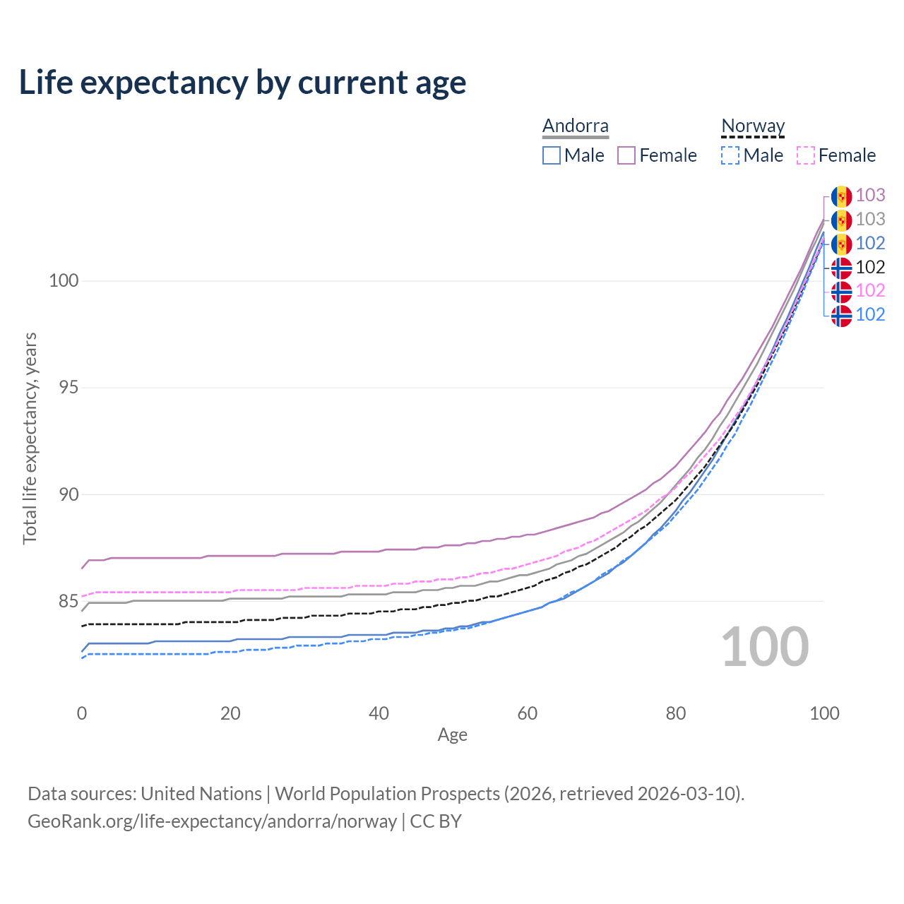 This life expectancy calculator shows the odds of living to 100, 95, 90, and below based on current age for both males and females in Andorra and Norway, along with mean and median age of death. The calculations are based on the 2026 life tables (actuarial tables) from the UN World Population Prospects.