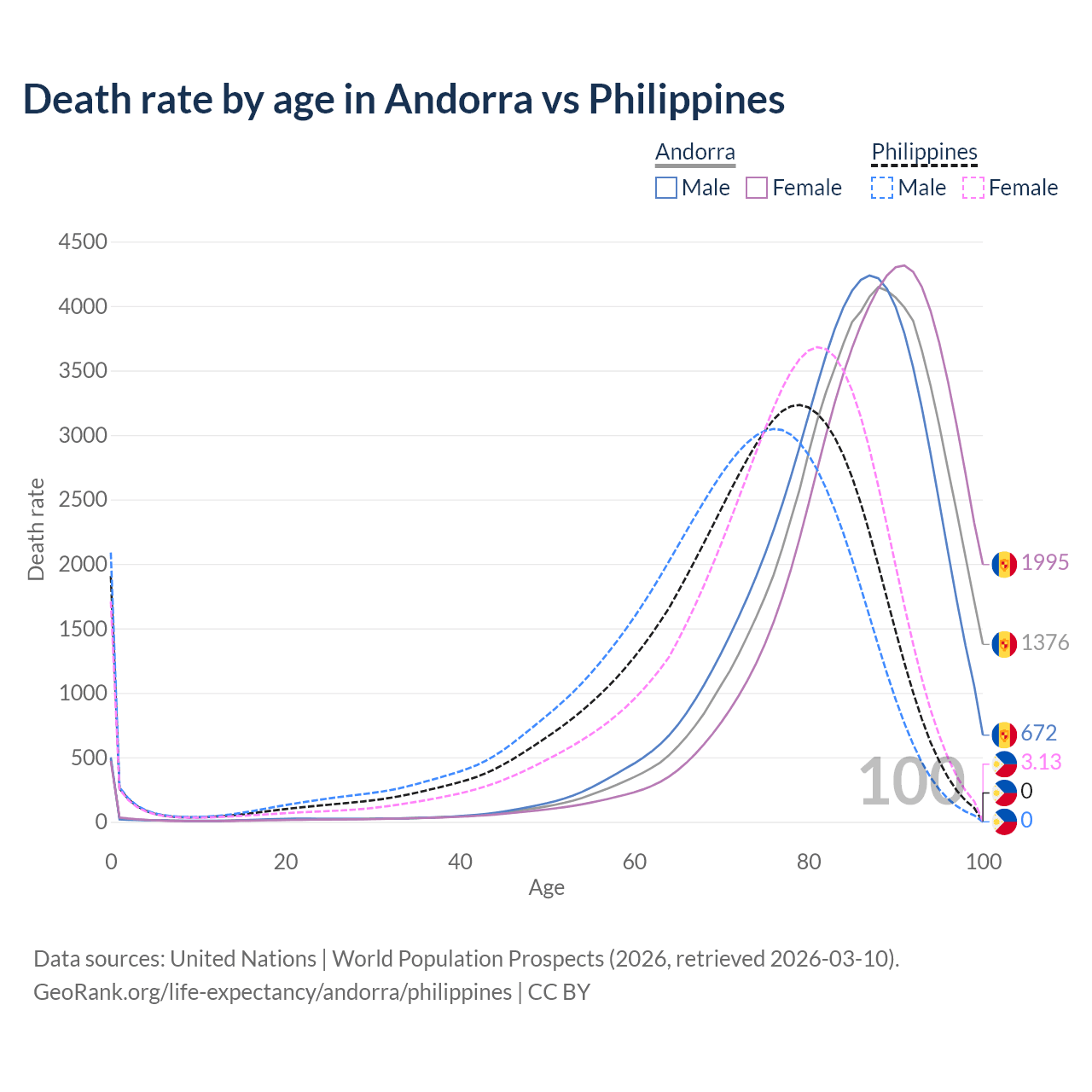 This life expectancy calculator shows the odds of living to 100, 95, 90, and below based on current age for both males and females in Andorra and the Philippines, along with mean and median age of death. The calculations are based on the 2026 life tables (actuarial tables) from the UN World Population Prospects.