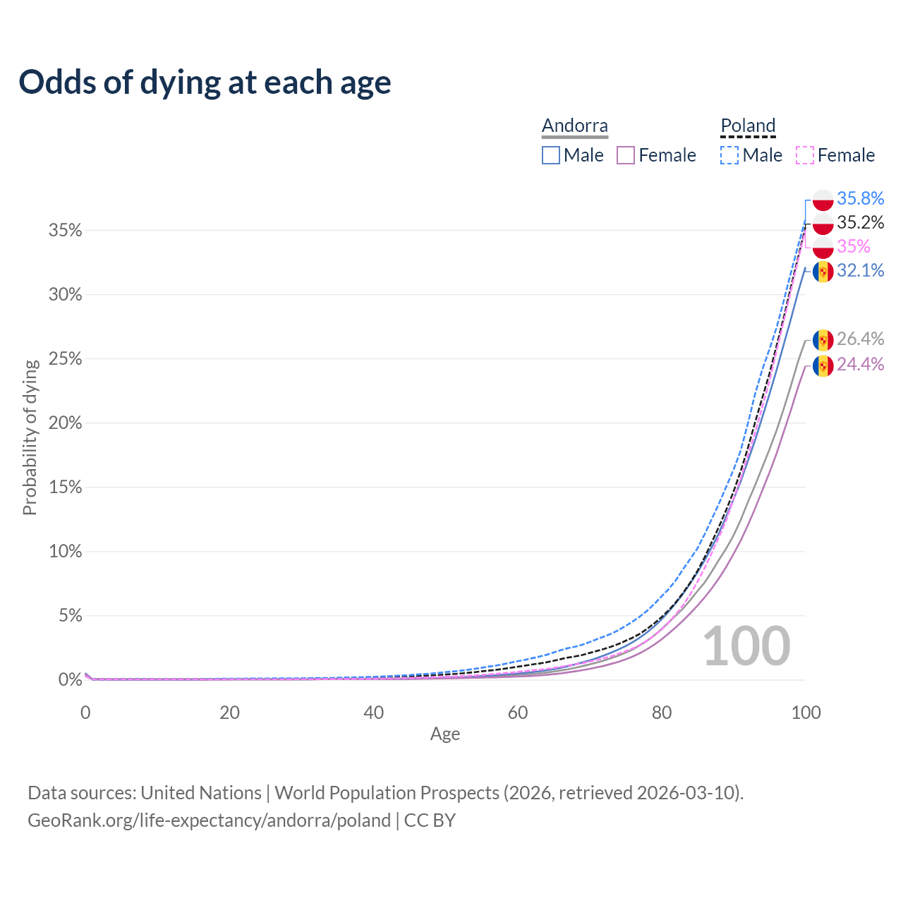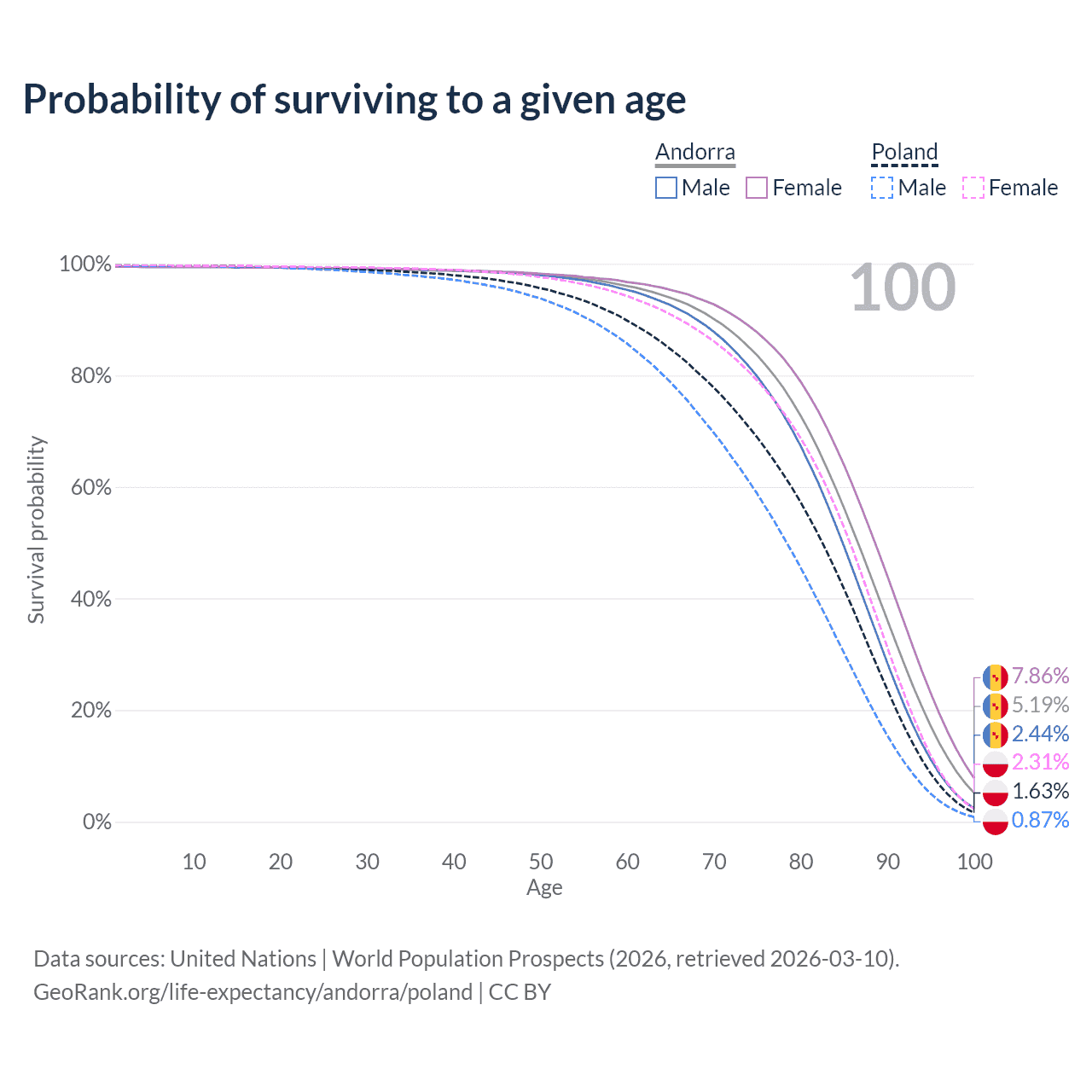 This life expectancy calculator shows the odds of living to 100, 95, 90, and below based on current age for both males and females in Andorra and Poland, along with mean and median age of death. The calculations are based on the 2026 life tables (actuarial tables) from the UN World Population Prospects.