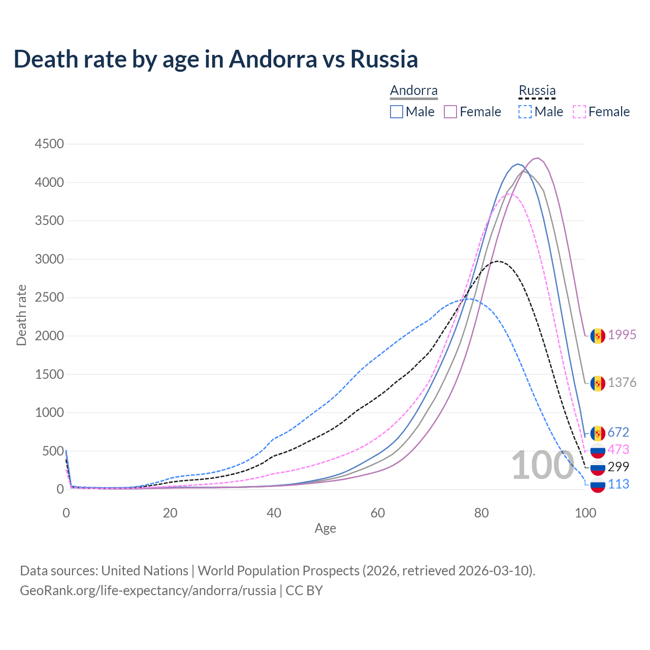 This life expectancy calculator shows the odds of living to 100, 95, 90, and below based on current age for both males and females in Andorra and Russia, along with mean and median age of death. The calculations are based on the 2026 life tables (actuarial tables) from the UN World Population Prospects.