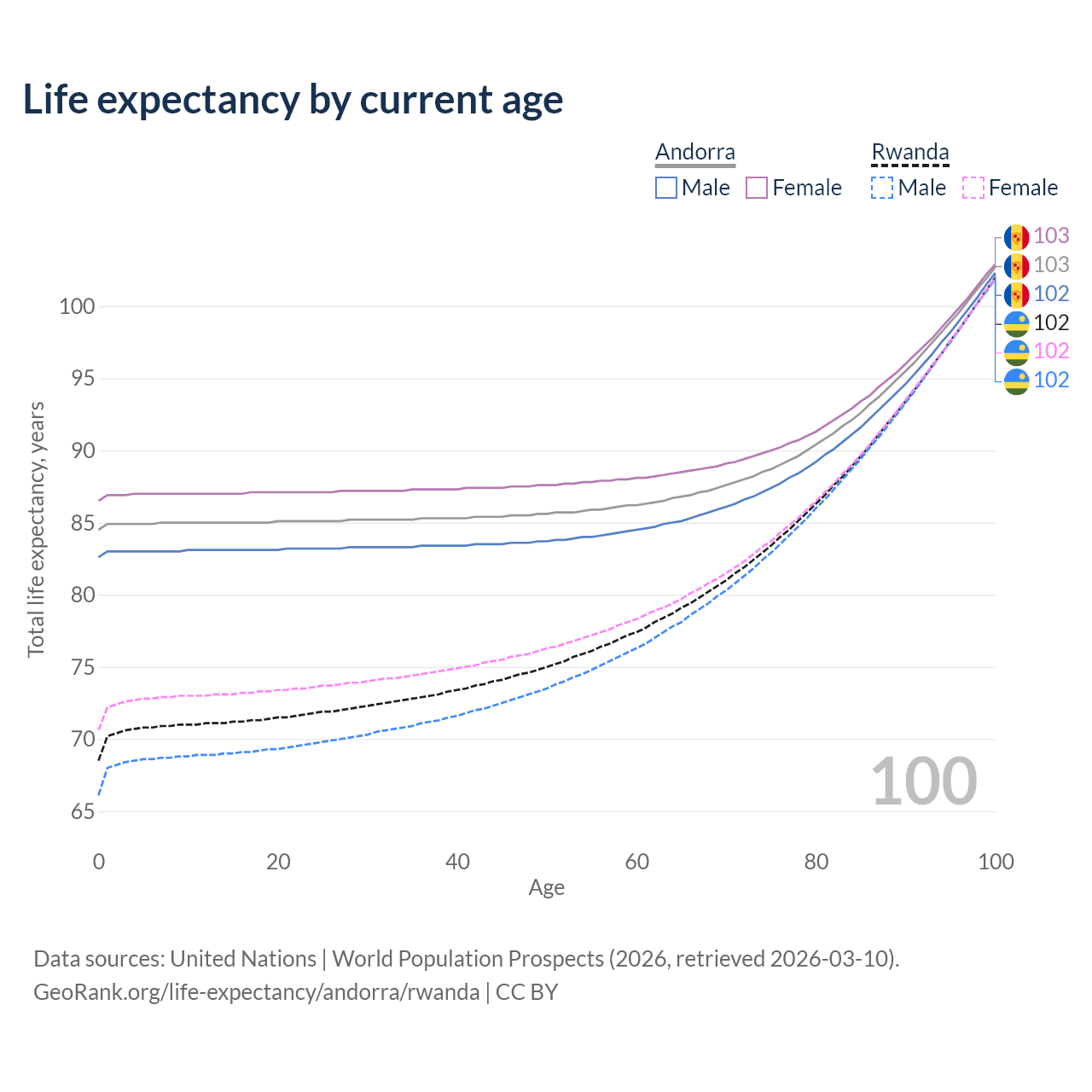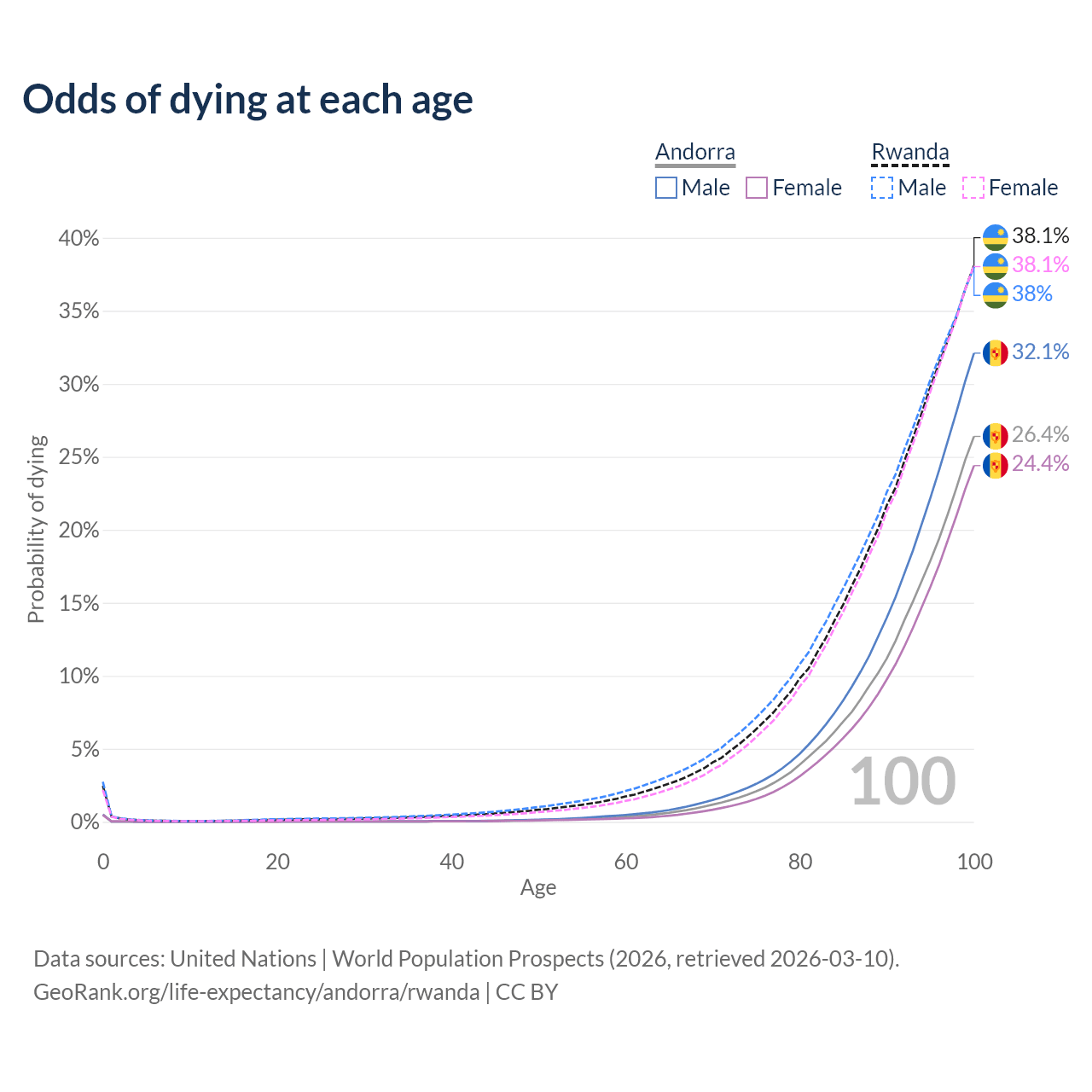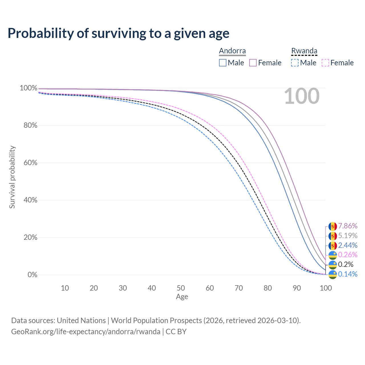 This life expectancy calculator shows the odds of living to 100, 95, 90, and below based on current age for both males and females in Andorra and Rwanda, along with mean and median age of death. The calculations are based on the 2026 life tables (actuarial tables) from the UN World Population Prospects.