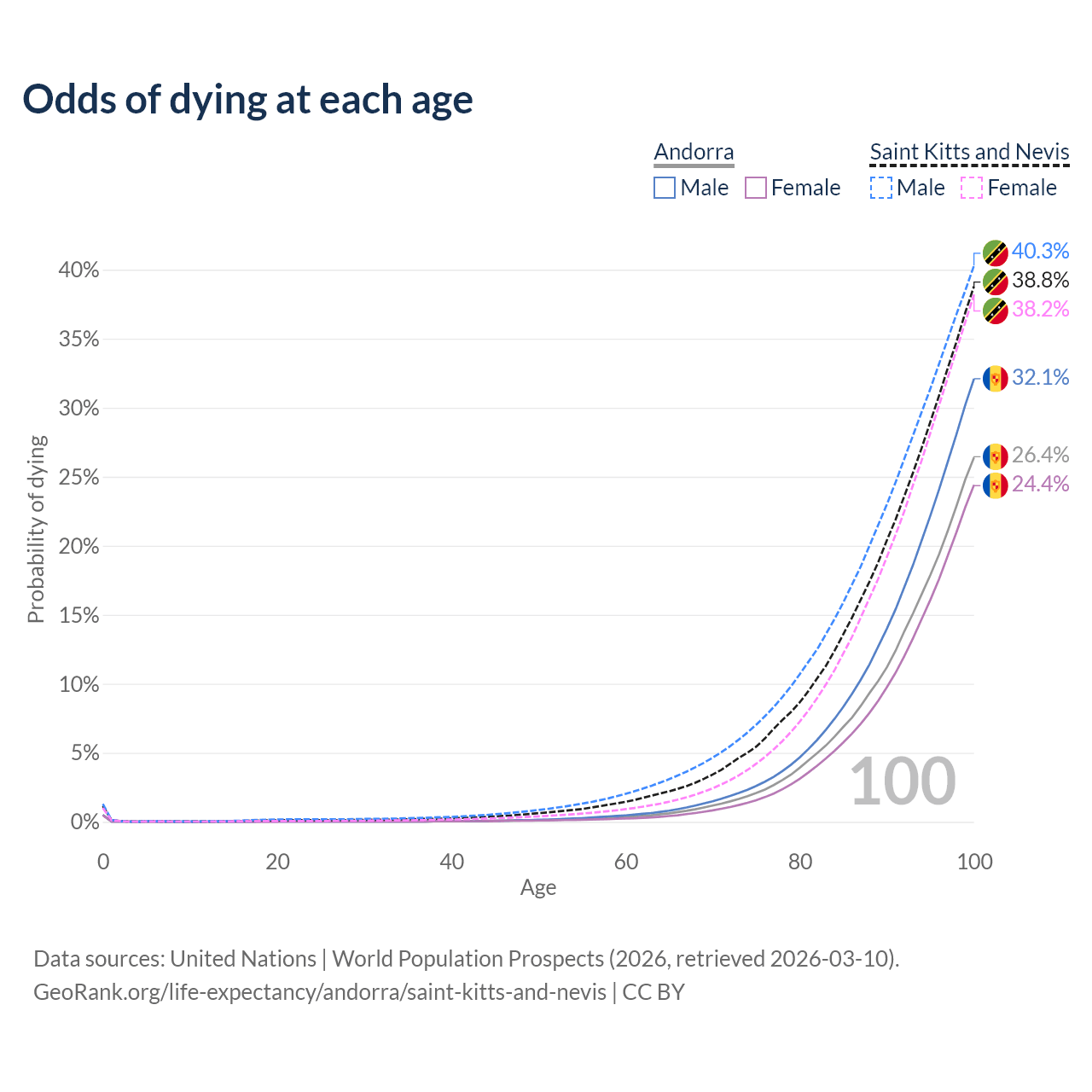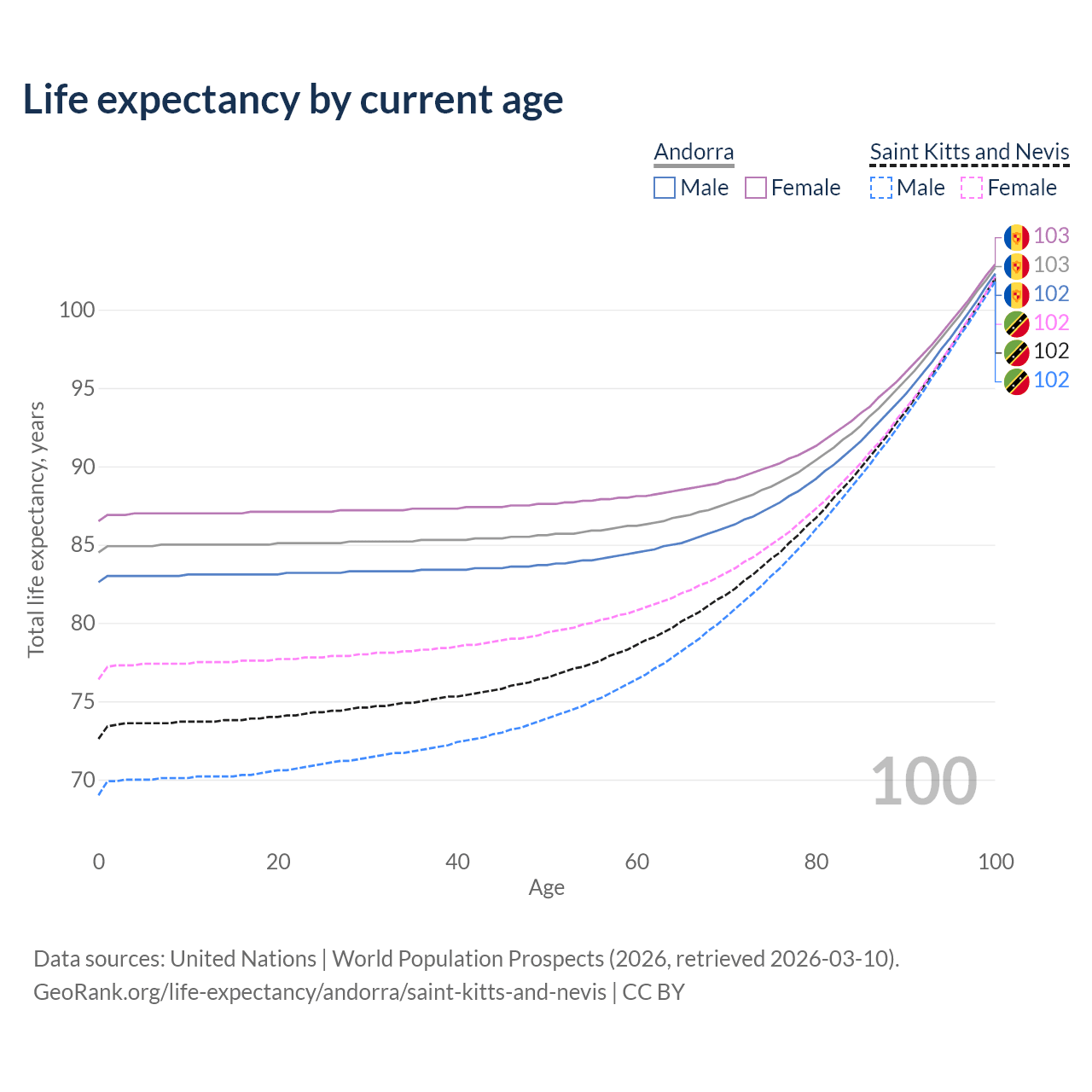This life expectancy calculator shows the odds of living to 100, 95, 90, and below based on current age for both males and females in Andorra and Saint Kitts and Nevis, along with mean and median age of death. The calculations are based on the 2026 life tables (actuarial tables) from the UN World Population Prospects.