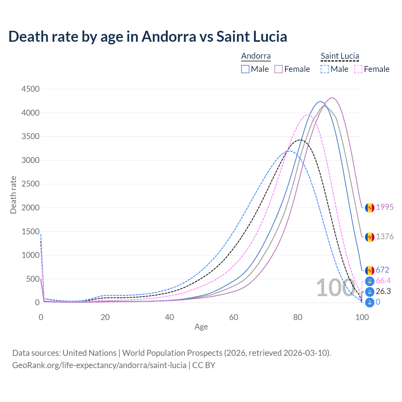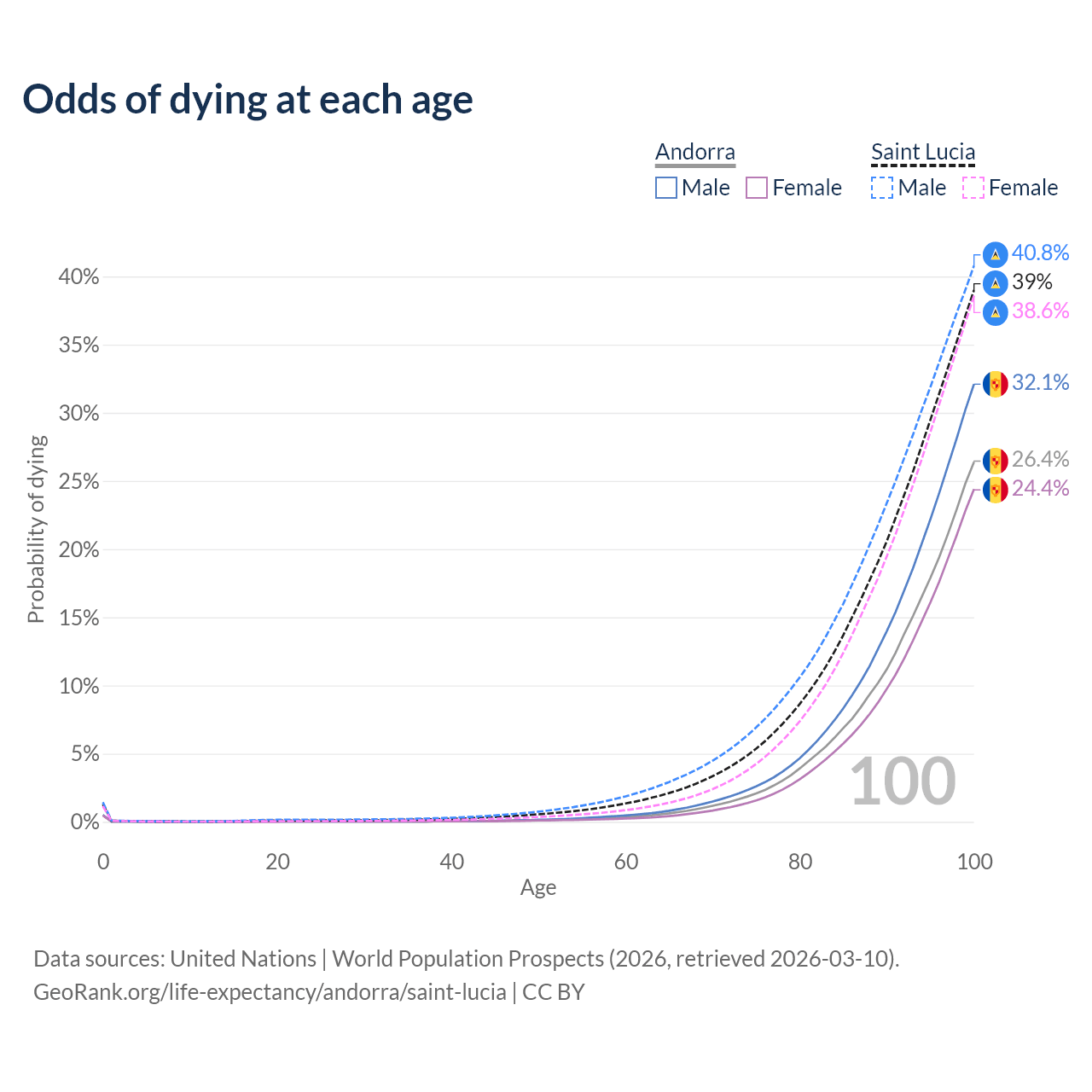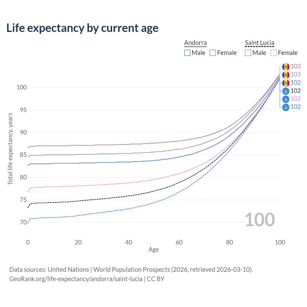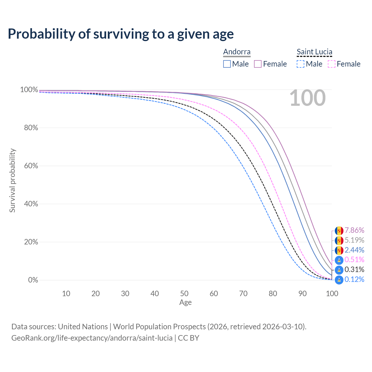 This life expectancy calculator shows the odds of living to 100, 95, 90, and below based on current age for both males and females in Andorra and Saint Lucia, along with mean and median age of death. The calculations are based on the 2026 life tables (actuarial tables) from the UN World Population Prospects.