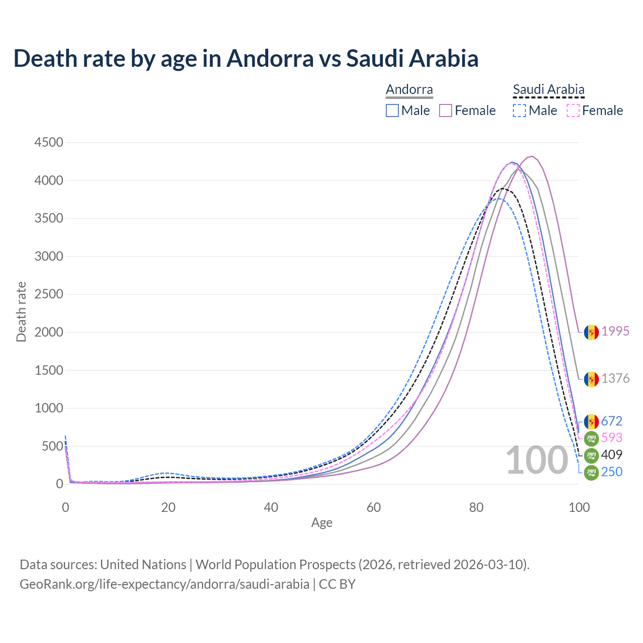 In Andorra, the most common age of death is 88, compared to 85 in Saudi Arabia. The median age of death is 86.6 in Andorra and 82.5 in Saudi Arabia, meaning only half of each cohort is expected to live past that age.