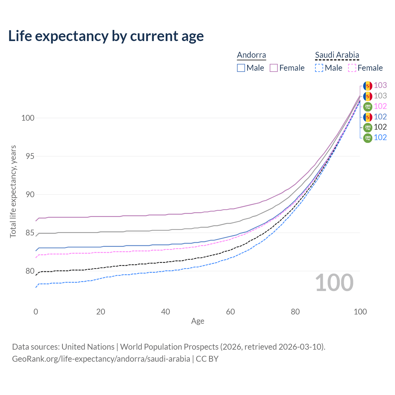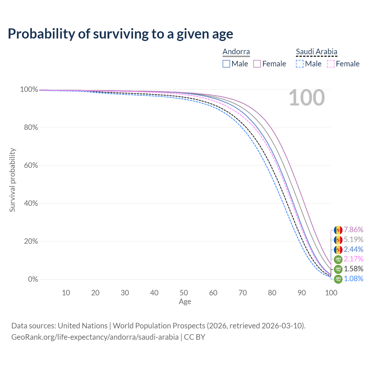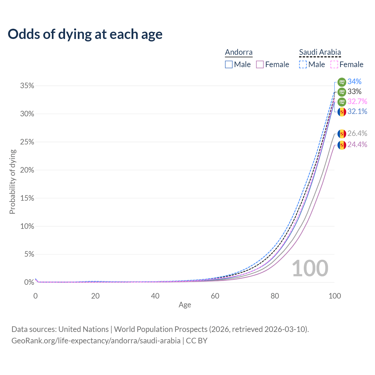 This life expectancy calculator shows the odds of living to 100, 95, 90, and below based on current age for both males and females in Andorra and Saudi Arabia, along with mean and median age of death. The calculations are based on the 2026 life tables (actuarial tables) from the UN World Population Prospects.