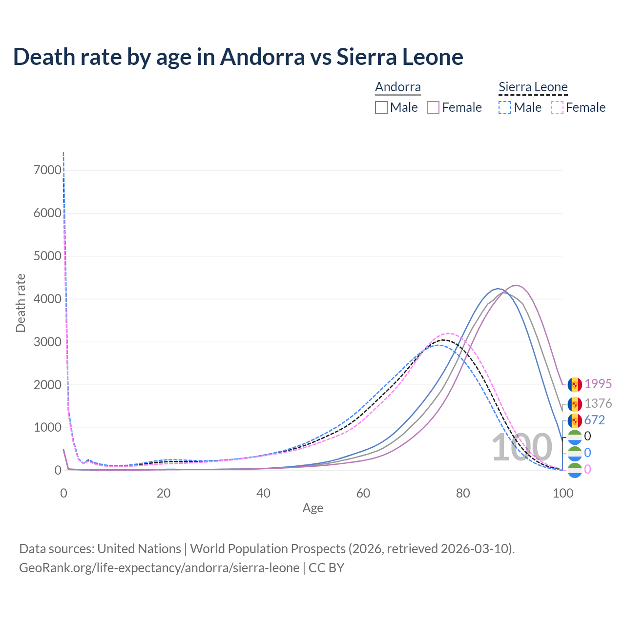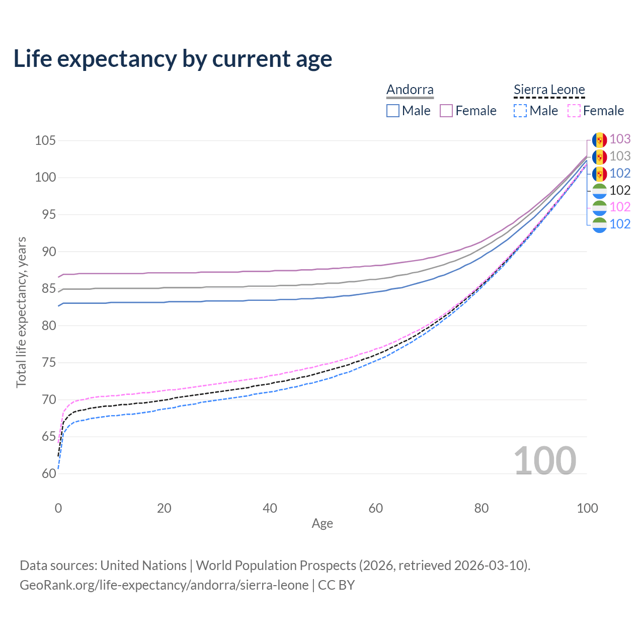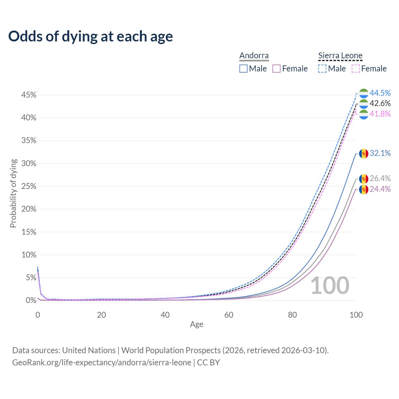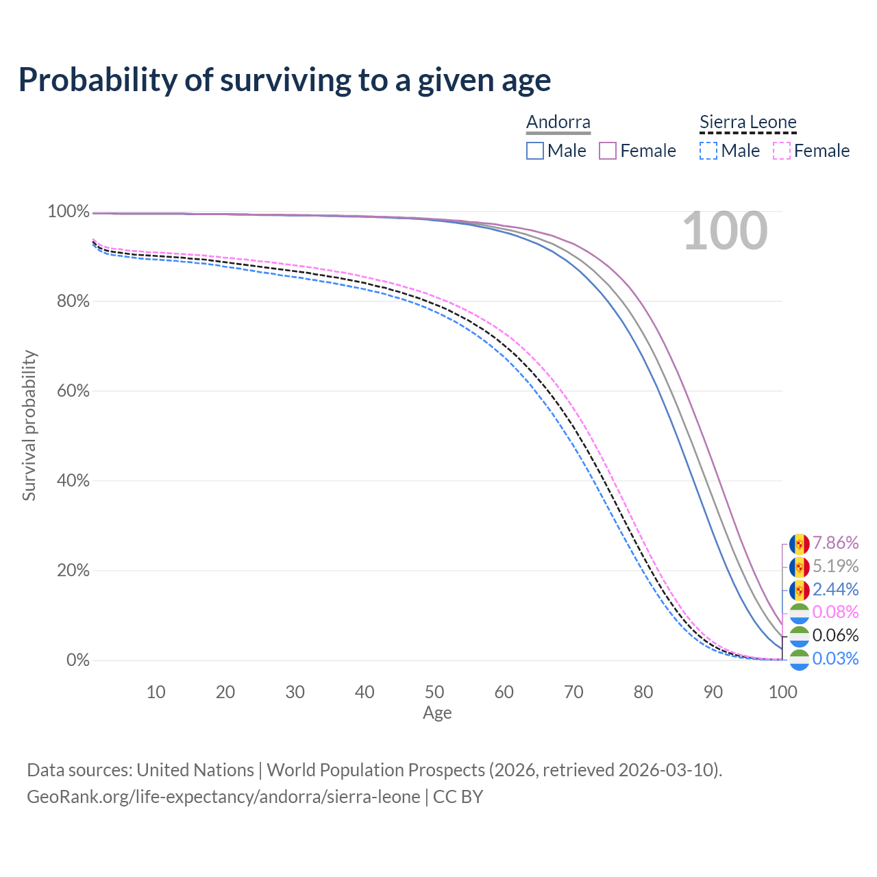 This life expectancy calculator shows the odds of living to 100, 95, 90, and below based on current age for both males and females in Andorra and Sierra Leone, along with mean and median age of death. The calculations are based on the 2026 life tables (actuarial tables) from the UN World Population Prospects.