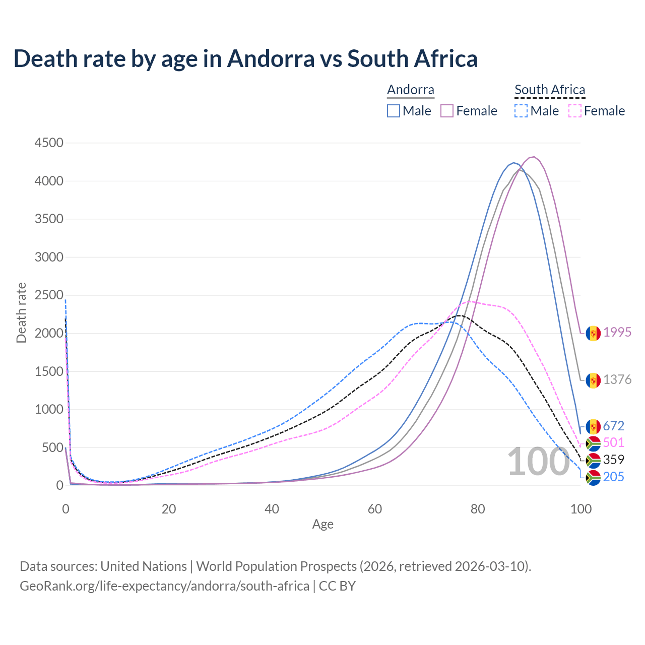 In Andorra, the most common age of death is 88, compared to 77 in South Africa. The median age of death is 86.6 in Andorra and 70.8 in South Africa, meaning only half of each cohort is expected to live past that age.