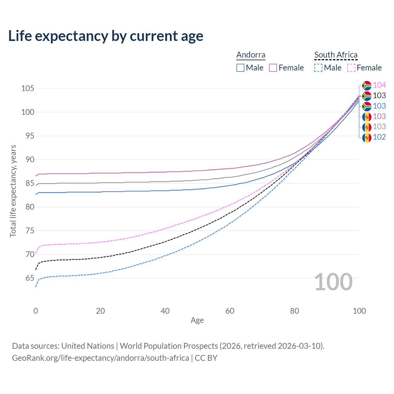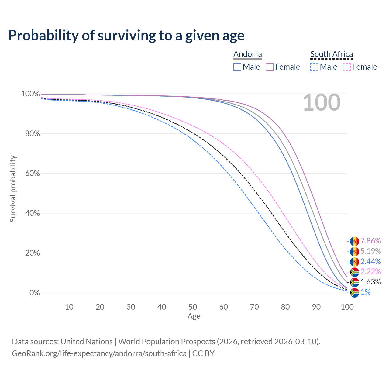 This life expectancy calculator shows the odds of living to 100, 95, 90, and below based on current age for both males and females in Andorra and South Africa, along with mean and median age of death. The calculations are based on the 2026 life tables (actuarial tables) from the UN World Population Prospects.