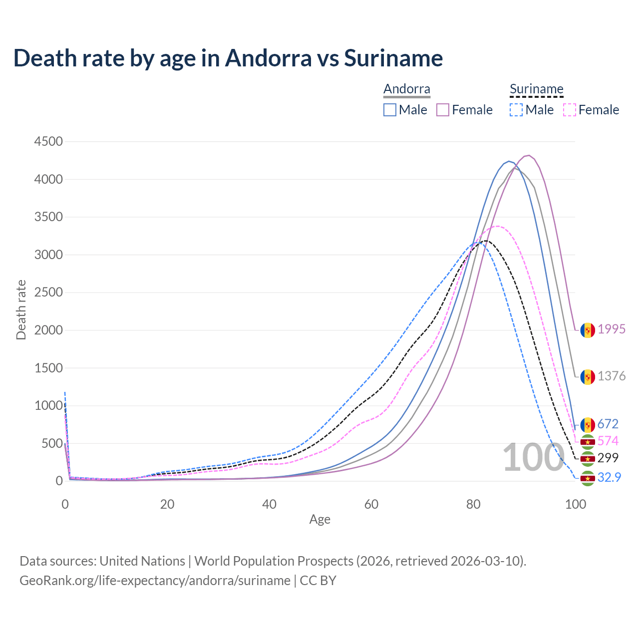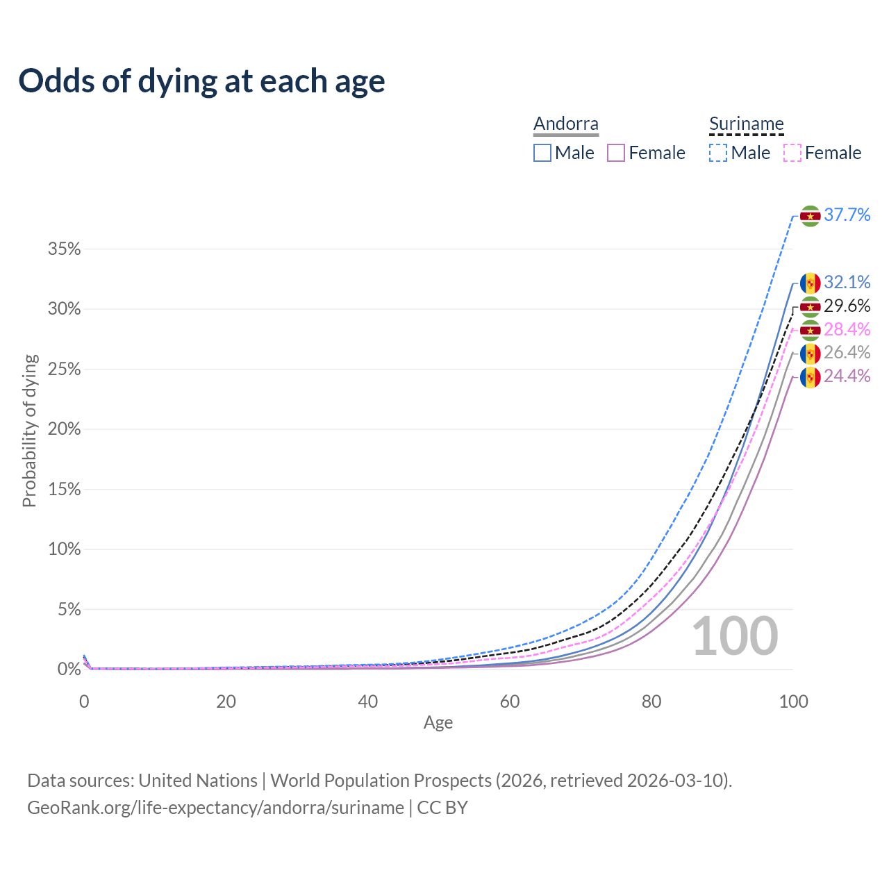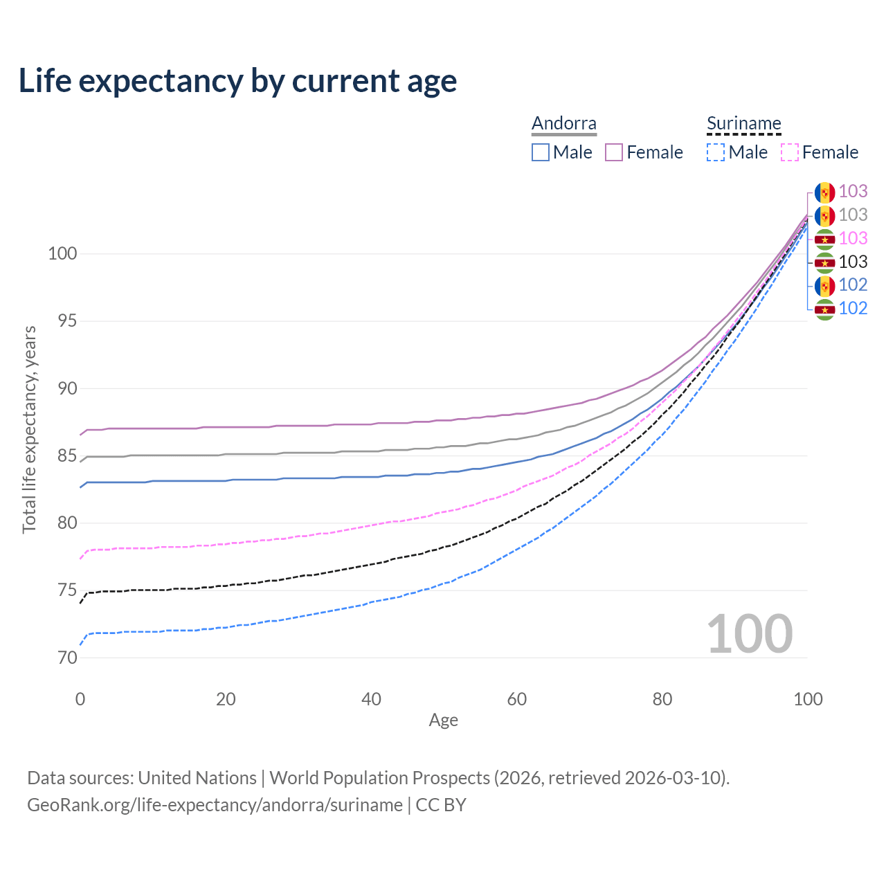 This life expectancy calculator shows the odds of living to 100, 95, 90, and below based on current age for both males and females in Andorra and Suriname, along with mean and median age of death. The calculations are based on the 2026 life tables (actuarial tables) from the UN World Population Prospects.