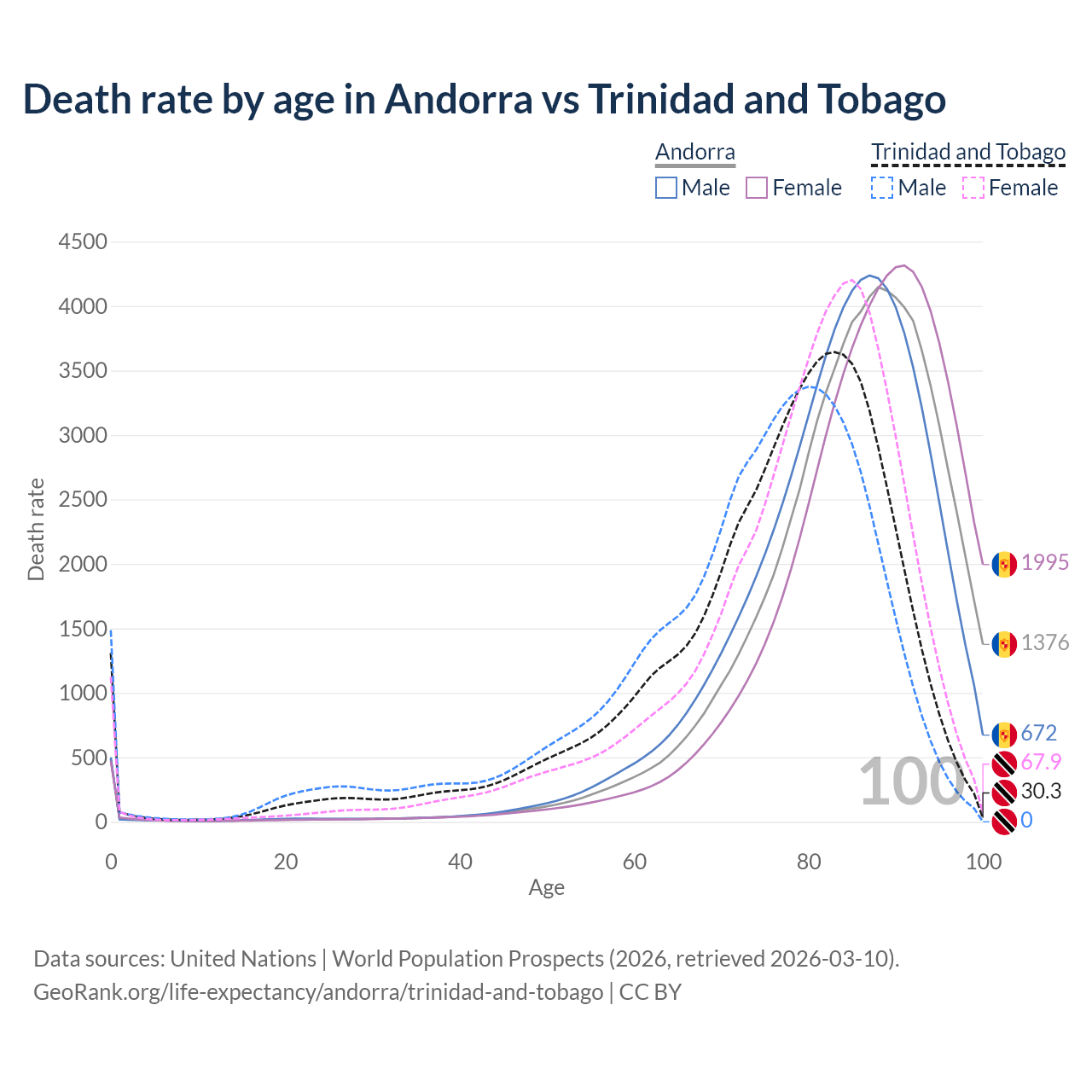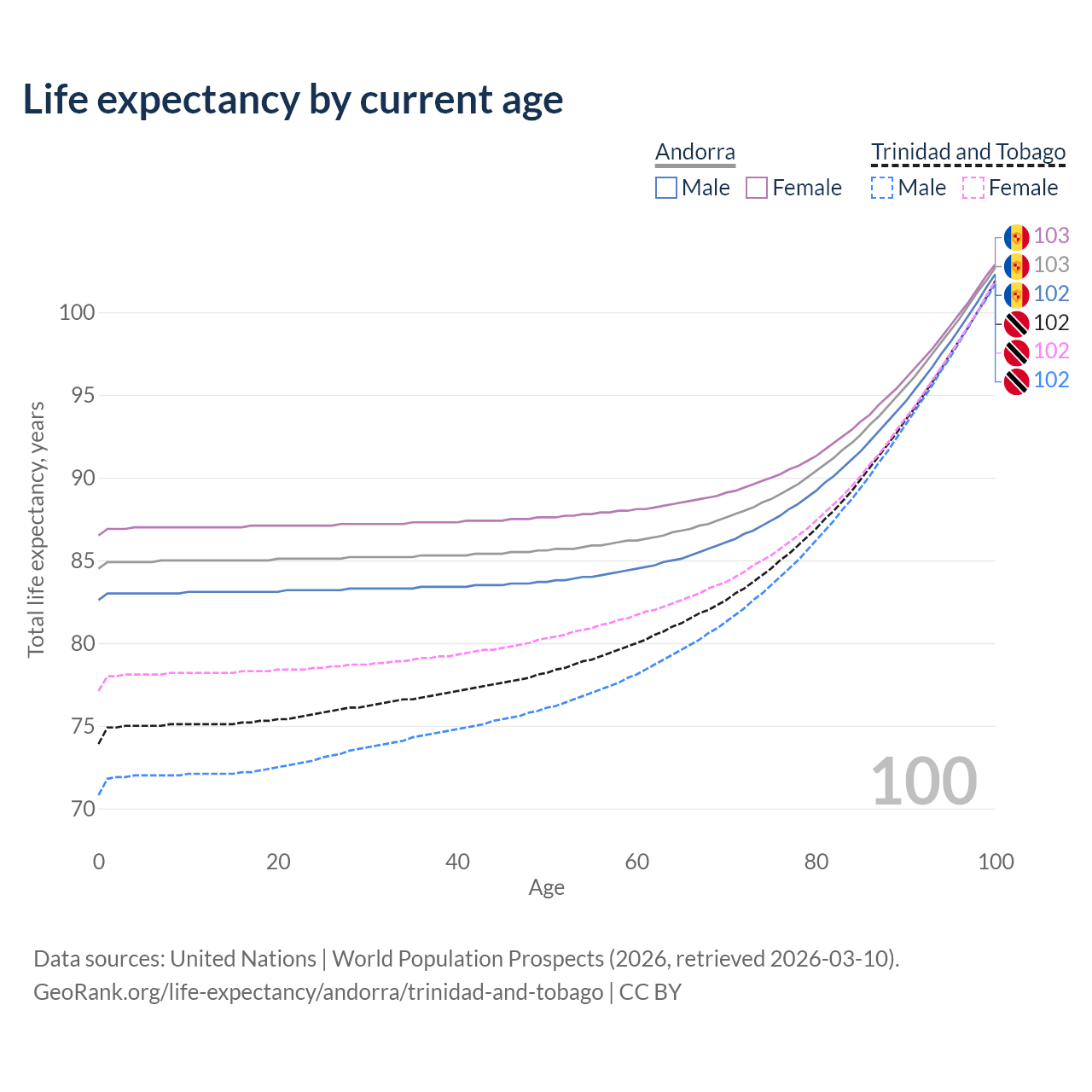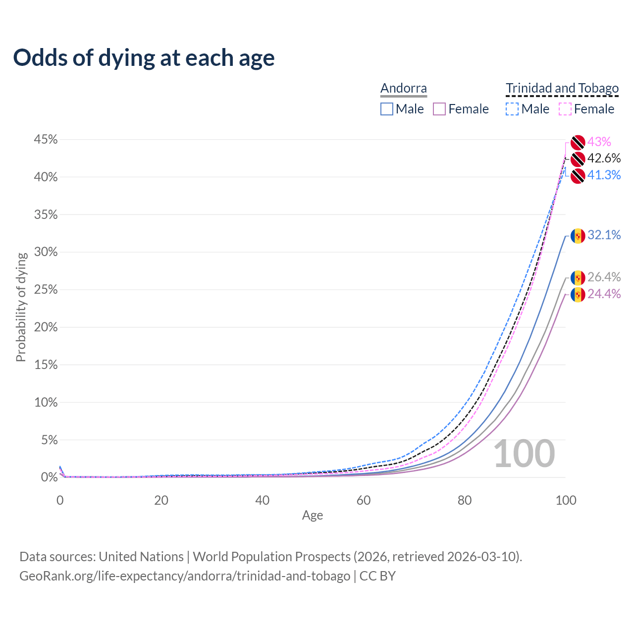 This life expectancy calculator shows the odds of living to 100, 95, 90, and below based on current age for both males and females in Andorra and Trinidad and Tobago, along with mean and median age of death. The calculations are based on the 2026 life tables (actuarial tables) from the UN World Population Prospects.
