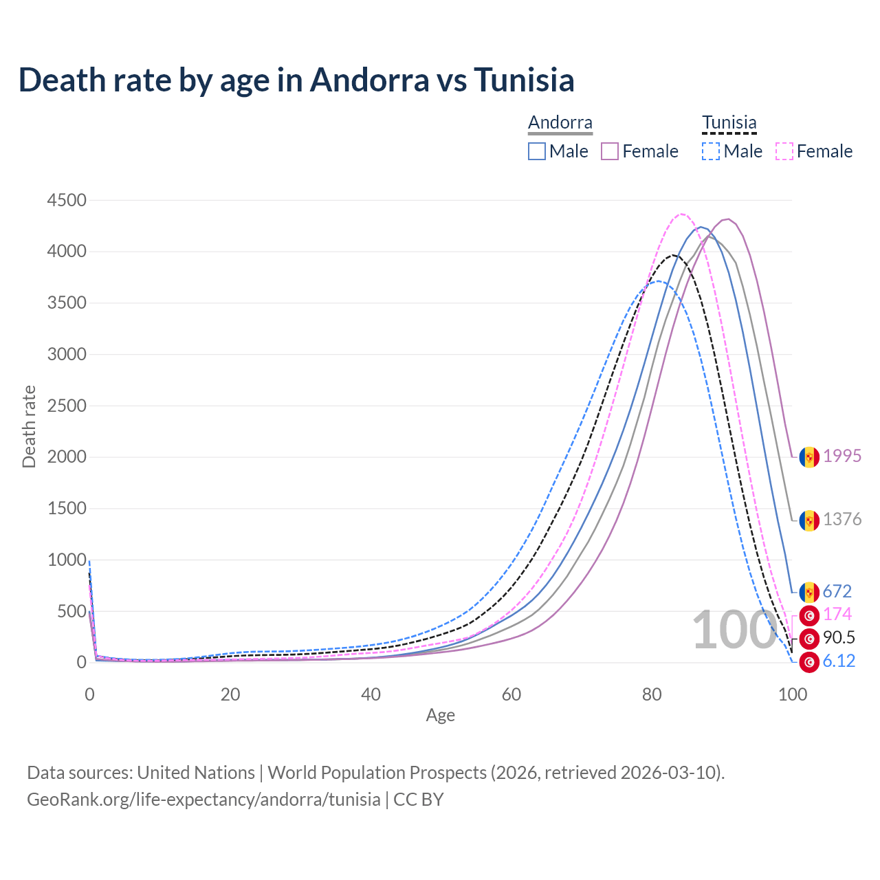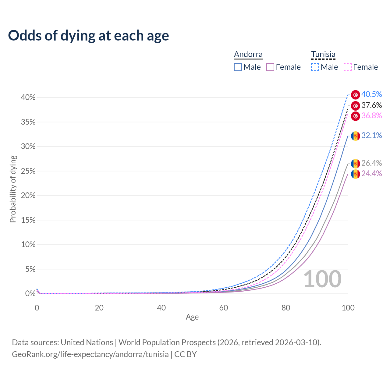 This life expectancy calculator shows the odds of living to 100, 95, 90, and below based on current age for both males and females in Andorra and Tunisia, along with mean and median age of death. The calculations are based on the 2026 life tables (actuarial tables) from the UN World Population Prospects.